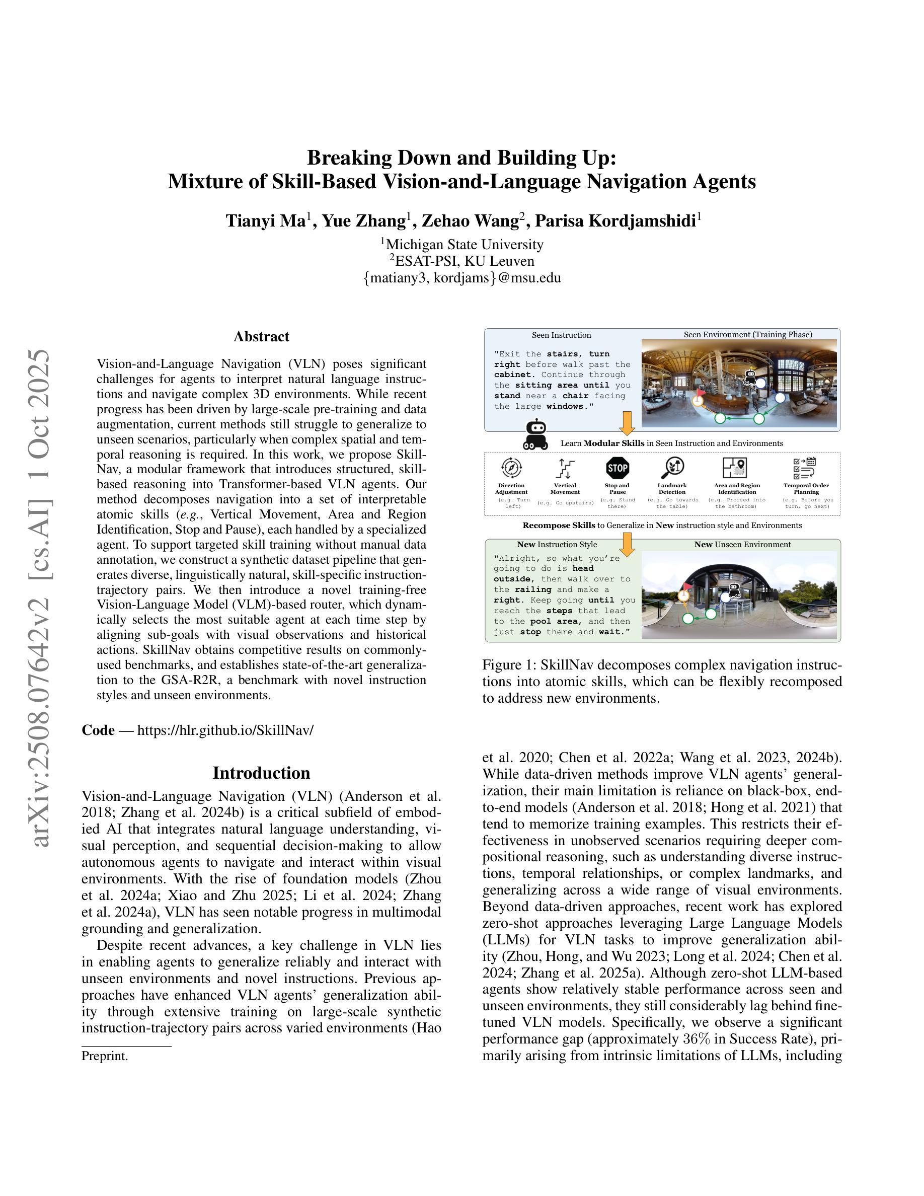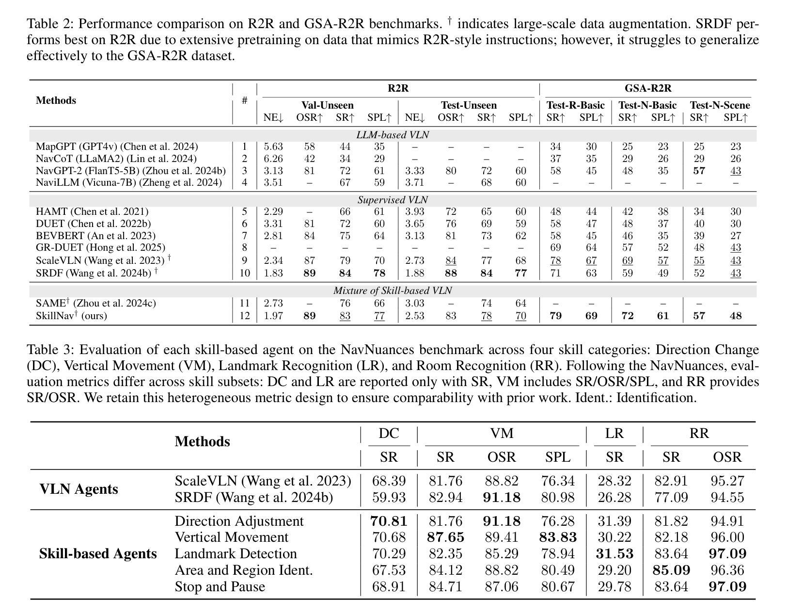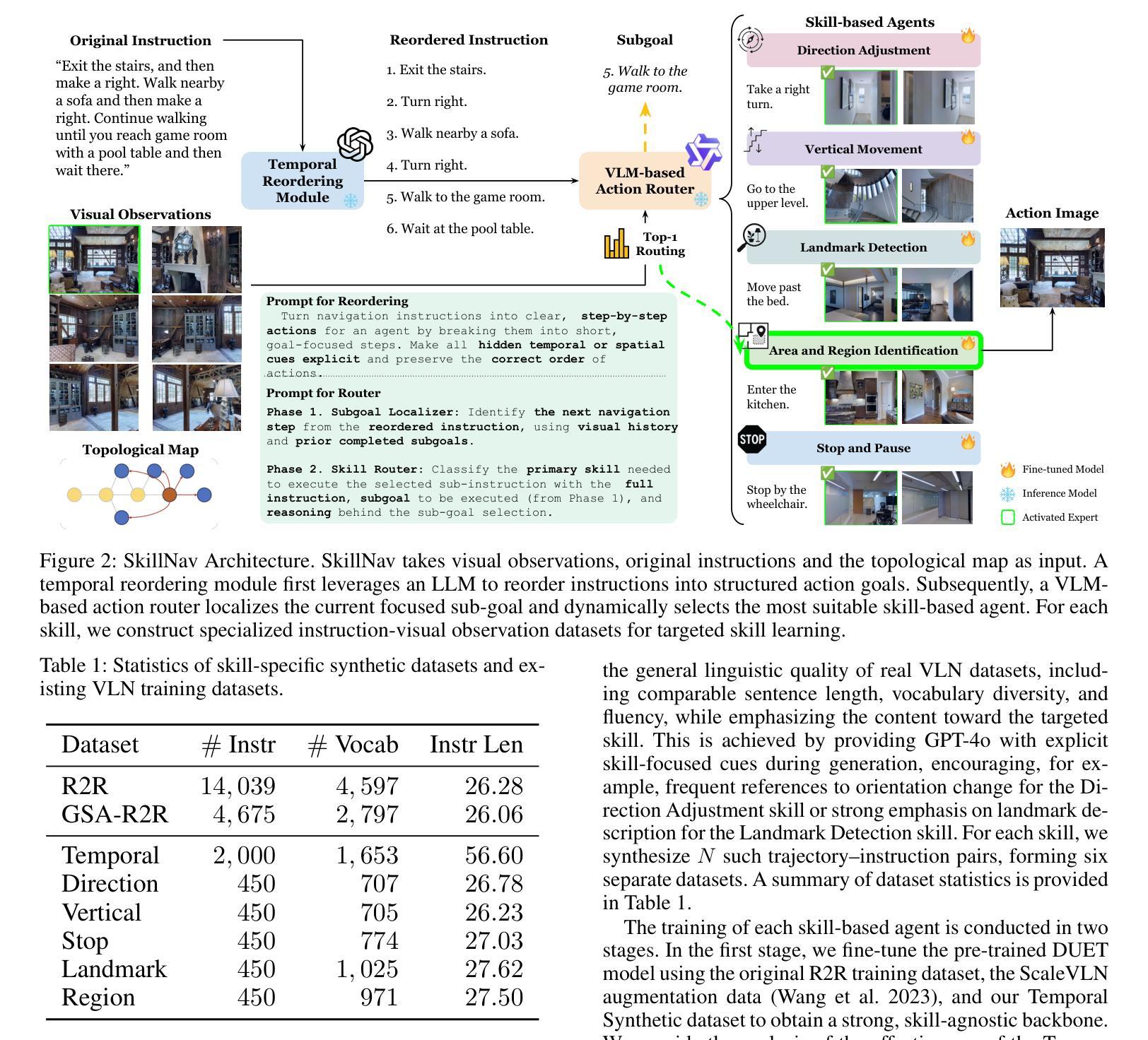 视觉与语言导航(VLN)对代理提出了重大挑战,要求代理解释自然语言指令并导航复杂的3D环境。尽管最近的进展得益于大规模预训练和数据增强,但当前的方法仍然难以推广到未见过的场景,特别是在需要复杂的空间和时间推理时。在这项工作中,我们提出了SkillNav,这是一个模块化框架,它将结构化、基于技能的推理引入到基于Transformer的VLN代理中。我们的方法将导航分解成一组可解释的原子技能(例如垂直移动、区域识别、停止和暂停等),每个技能都由一个专门的代理处理。为了支持有针对性的技能训练而无需手动数据标注,我们构建了一个合成数据集管道,该管道生成多样、语言自然、技能特定的指令-轨迹对。然后,我们引入了一种新型的基于训练视觉语言模型(VLM)的路由器,该路由器通过将与视觉观察和历史行动的子目标对齐,在每个时间步长动态选择最合适的代理。SkillNav在常用基准测试上取得了具有竞争力的结果,并在具有新型指令风格和未见过的环境的GSA-R2R基准测试上达到了最先进的推广效果。