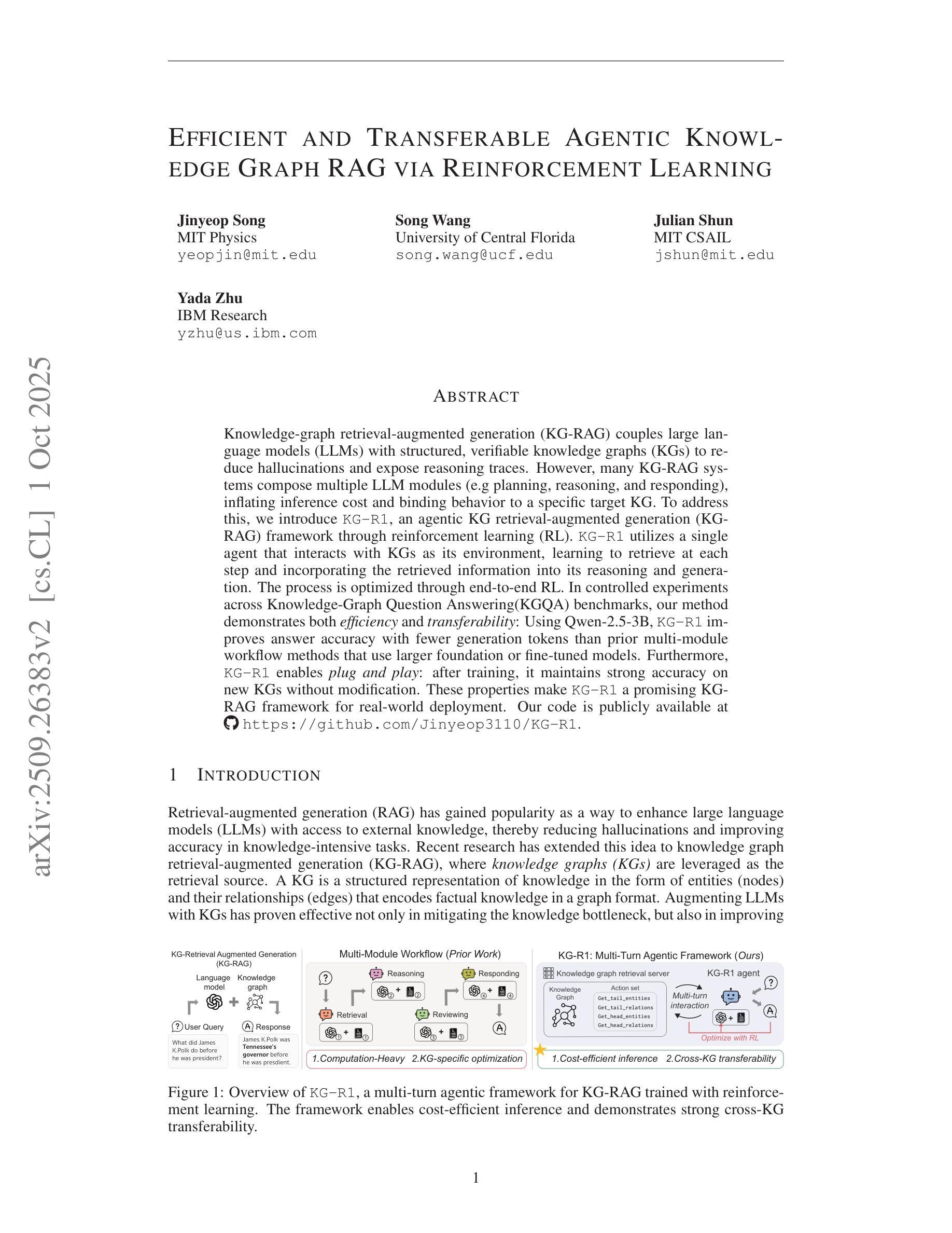 知识图谱检索增强生成(KG-RAG)将大型语言模型(LLM)与结构化的、可验证的知识图谱(KG)相结合,以减少幻想并暴露推理痕迹。然而,许多KG-RAG系统由多个LLM模块(如规划、推理和响应)组成,增加了推理成本,并且绑定到特定的目标知识图谱上。为了解决这个问题,我们引入了KG-R1,这是一个通过强化学习(RL)实现的知识图谱检索增强生成(KG-RAG)框架。KG-R1使用一个单独的智能体与环境中的知识图谱进行交互,学习如何逐步检索,并将检索到的信息融入其推理和生成中。该过程通过端到端的RL进行优化。在知识图谱问答(KGQA)基准测试上的受控实验表明,我们的方法既有效率又有可迁移性:使用Qwen-2.5-3B基准测试,KG-R1在较少的生成标记中提高了答案的准确性,优于先前的多模块工作流程方法,这些方法使用更大的基础模型或微调模型。此外,KG-R1还具有即插即用功能:训练后,它能够在无需修改的情况下在新的知识图谱上保持较高的准确性。这些特性使KG-R1成为面向现实世界部署的有希望的知识图谱检索增强生成框架。我们的代码公开在https://github.com/Jinyeop3110/KG-R1。