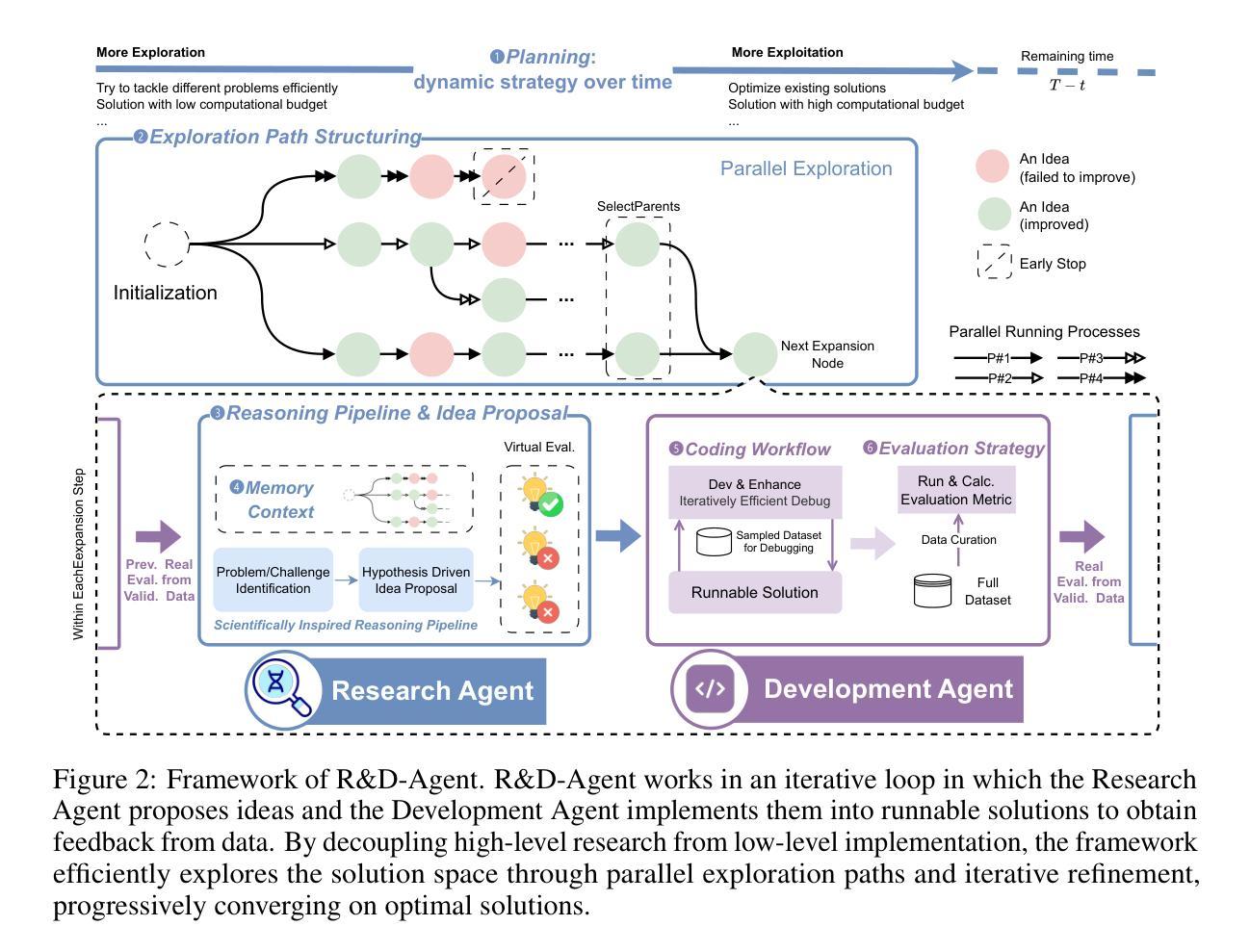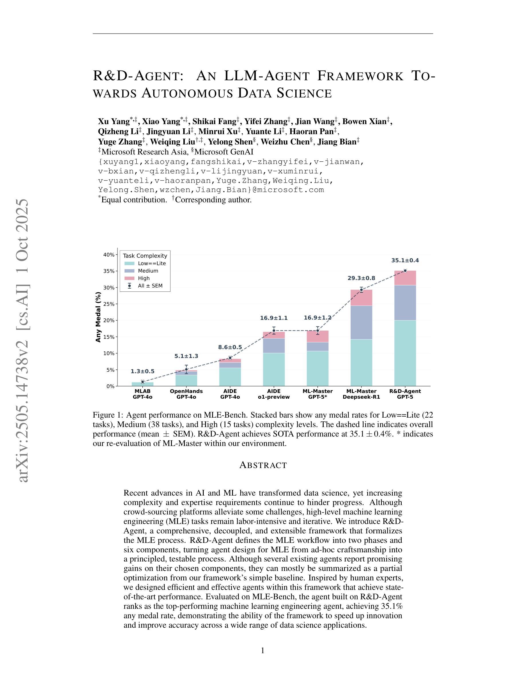 近期AI和ML的进步为数据科学带来了变革,但复杂性和专业知识的需求不断增加仍然阻碍了进展。虽然众筹平台缓解了一些挑战,但高级机器学习工程(MLE)任务仍然是劳动密集型和迭代型的。我们引入了R&D-Agent,这是一个全面、解耦和可扩展的框架,正式化MLE过程。R&D-Agent将MLE工作流程定义为两个阶段和六个组件,将MLE的代理设计从临时性的手艺转变为有原则的、可测试的过程。我们的框架在高效和有效的代理设计方面取得了最先进的性能。在MLE-Bench上评估,基于R&D-Agent的代理被评为表现最佳的MLE代理,获得奖牌率高达35.1%,证明了该框架在加速创新和提高各种数据科学应用准确性方面的能力。我们已在GitHub上开源R&D-Agent:https://github.com/microsoft/RD-Agent。