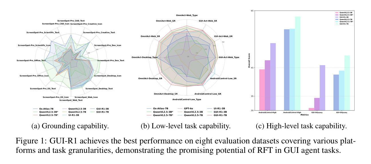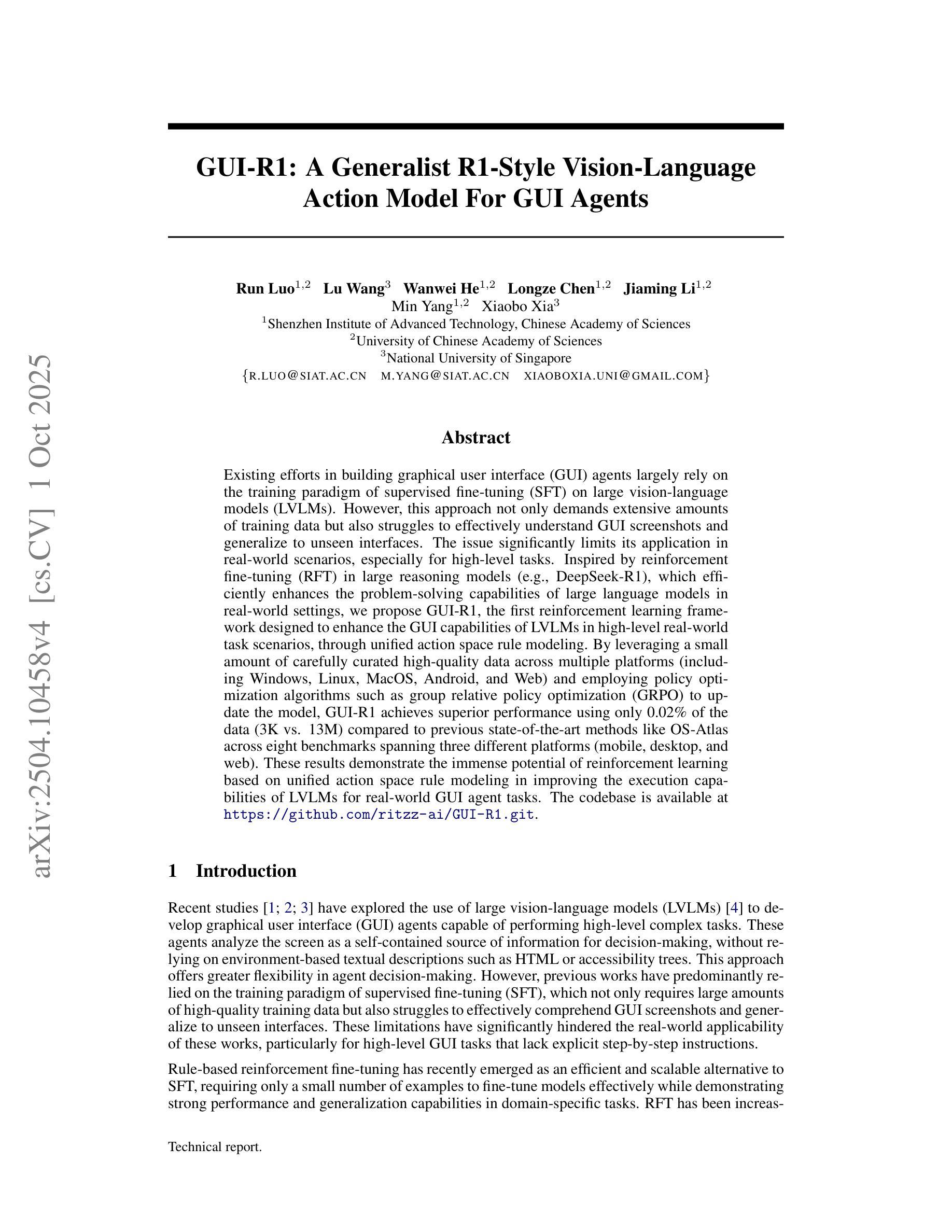 本文提出一种名为\name的强化学习框架,旨在通过统一动作空间规则建模,提高大型视觉语言模型(LVLMs)在高级现实世界任务场景中的GUI能力。该框架通过利用跨多个平台的少量高质量数据,并采用群体相对策略优化(GRPO)等策略优化算法来更新模型,实现了优越的性能。与之前的先进方法相比,使用的数据量大大减少(仅使用0.02%的数据),且在三个不同平台(移动、桌面和网页)上的八个基准测试中表现出色。这展示了基于统一动作空间规则建模的强化学习在提升LVLMs执行现实世界GUI任务能力方面的巨大潜力。