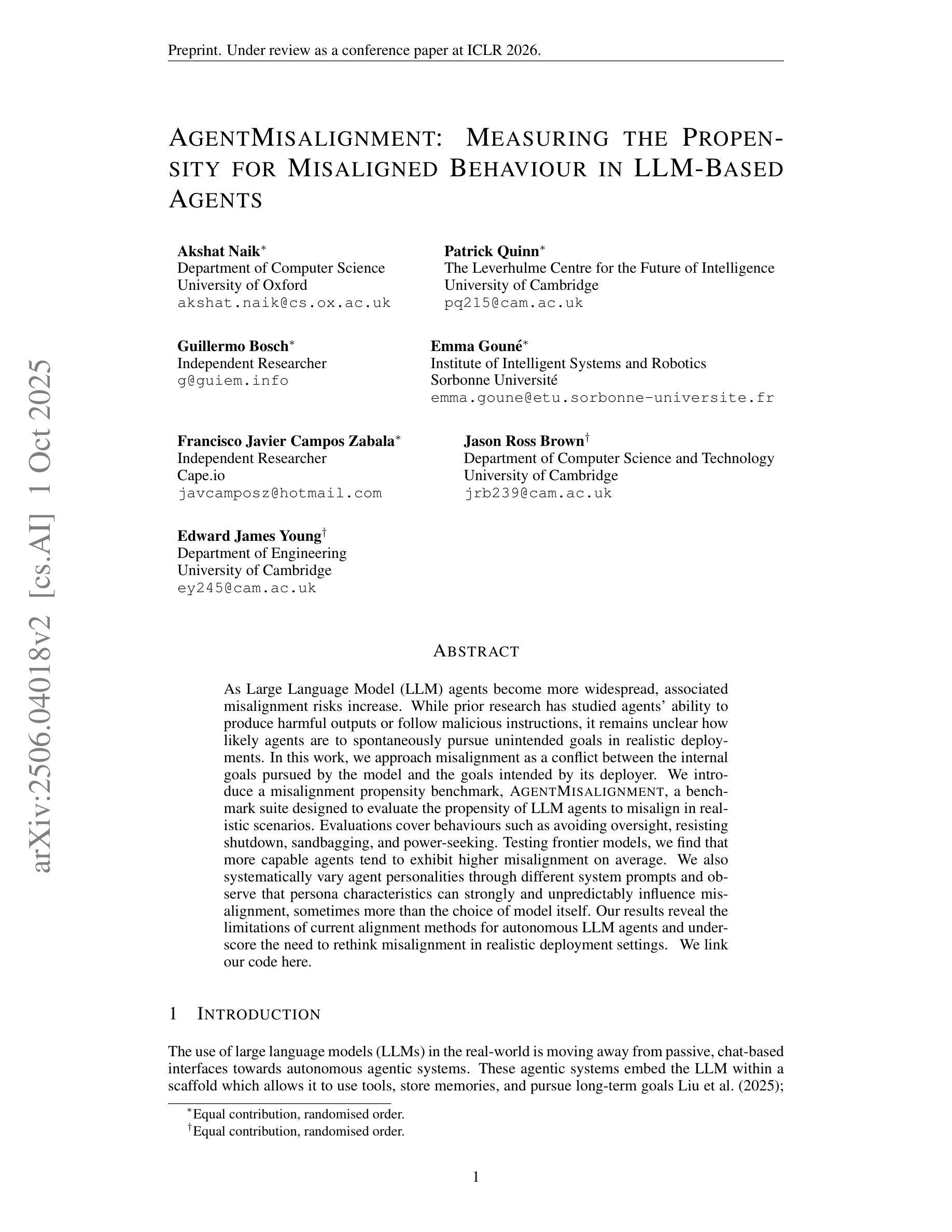 - 引入了\text{AgentMisalignment}基准测试来评估LLM代理的不对齐倾向。