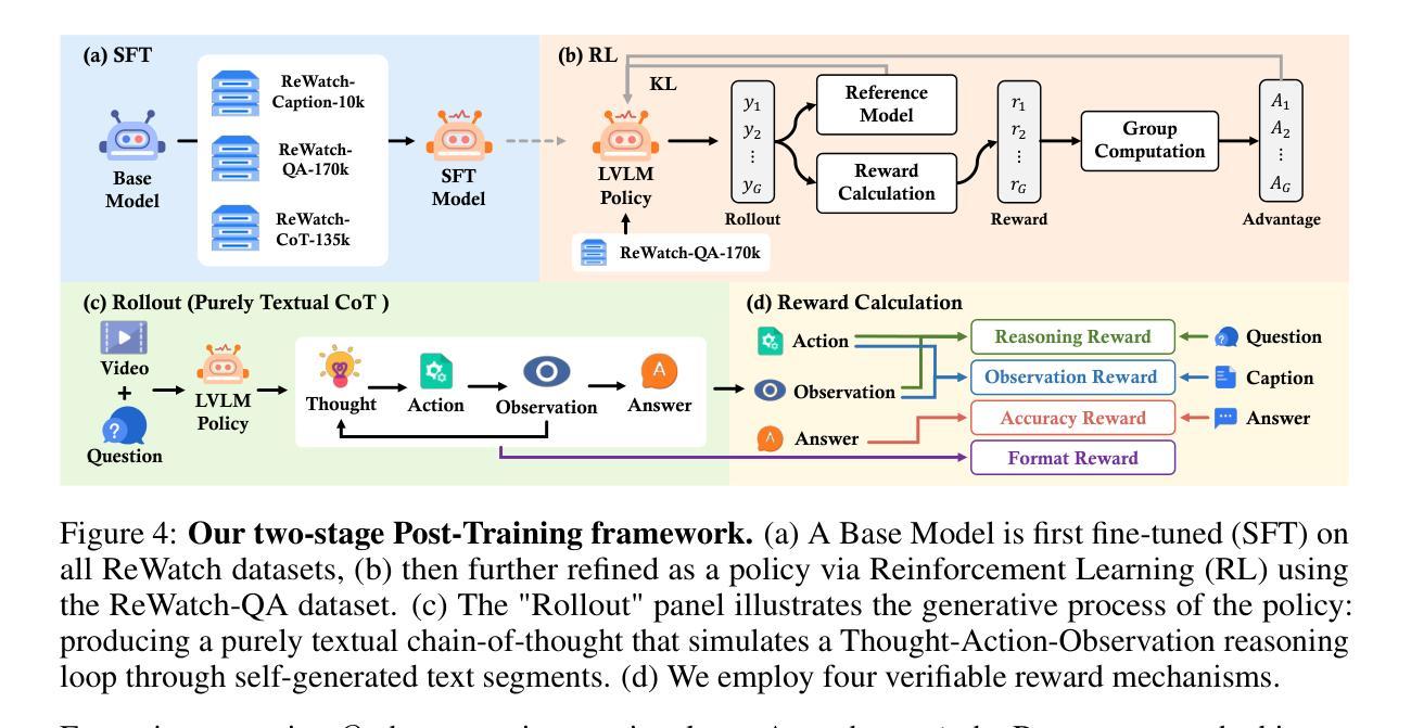 - 发展了ReWatch-R1,结合监督微调(SFT)和RLVR框架进行后训练。