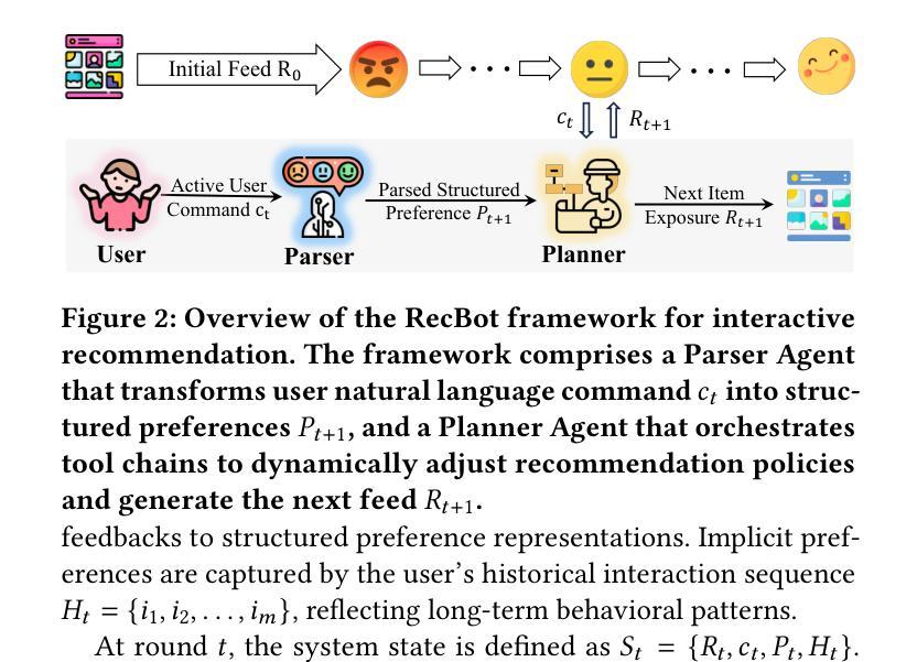 - RecBot是一个双代理架构,包括解析器代理和规划器代理,分别处理用户语言和策略调整。