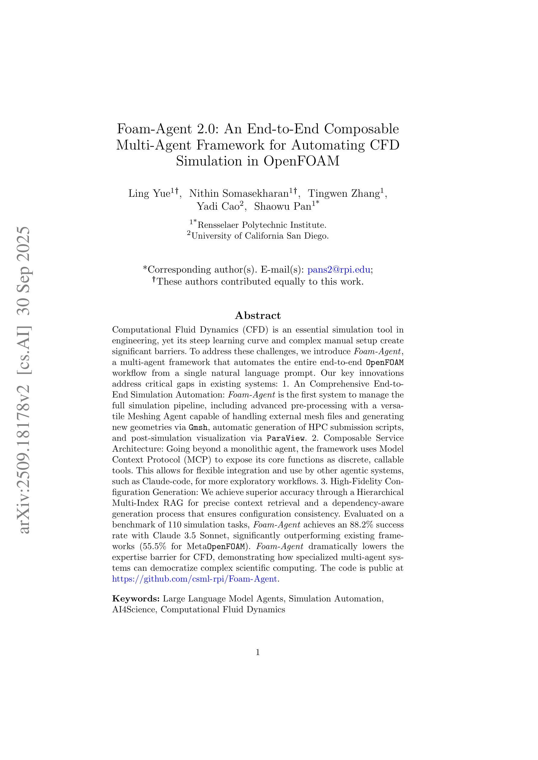 计算流体动力学(CFD)是工程中重要的模拟工具,但其陡峭的学习曲线和复杂的手动设置构成了重大障碍。为了解决这些挑战,我们引入了Foam-Agent,这是一个多智能体框架,可以通过单个自然语言提示自动完成整个OpenFOAM工作流。我们的关键创新解决了现有系统中的关键空白:1.全面的端到端仿真自动化:Foam-Agent是第一个管理完整仿真管道的系统,包括使用多功能网格代理进行高级预处理,能够处理外部网格文件并通过Gmsh生成新几何体,自动生成HPC提交脚本,以及通过ParaView进行仿真后的可视化。2.可组合的服务架构:超越单一智能体的框架,使用模型上下文协议(MCP)将其核心功能暴露为独立的、可调用的工具。这允许其他智能体系统,如Claude-code,进行灵活的集成和使用,以支持更探索性的工作流程。3.高保真配置生成:我们通过分层多索引RAG实现高级精度,用于精确上下文检索和依赖感知生成过程,确保配置一致性。在110个仿真任务基准测试中,Foam-Agent与Claude 3.5 Sonnet配合使用,成功率达到88.2%,显著优于现有框架(MetaOpenFOAM为55.5%)。Foam-Agent大大降低了CFD的专业知识壁垒,展示了专业多智能体系统是如何使复杂的科学计算普及化的。代码公开在https://github.com/csml-rpi/Foam-Agent。