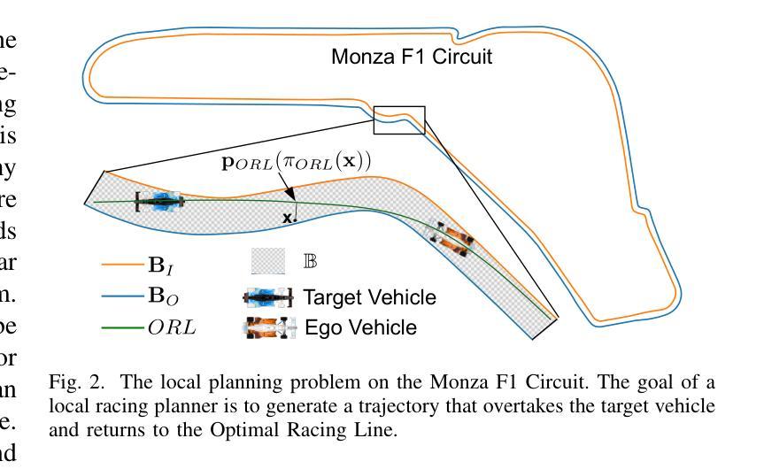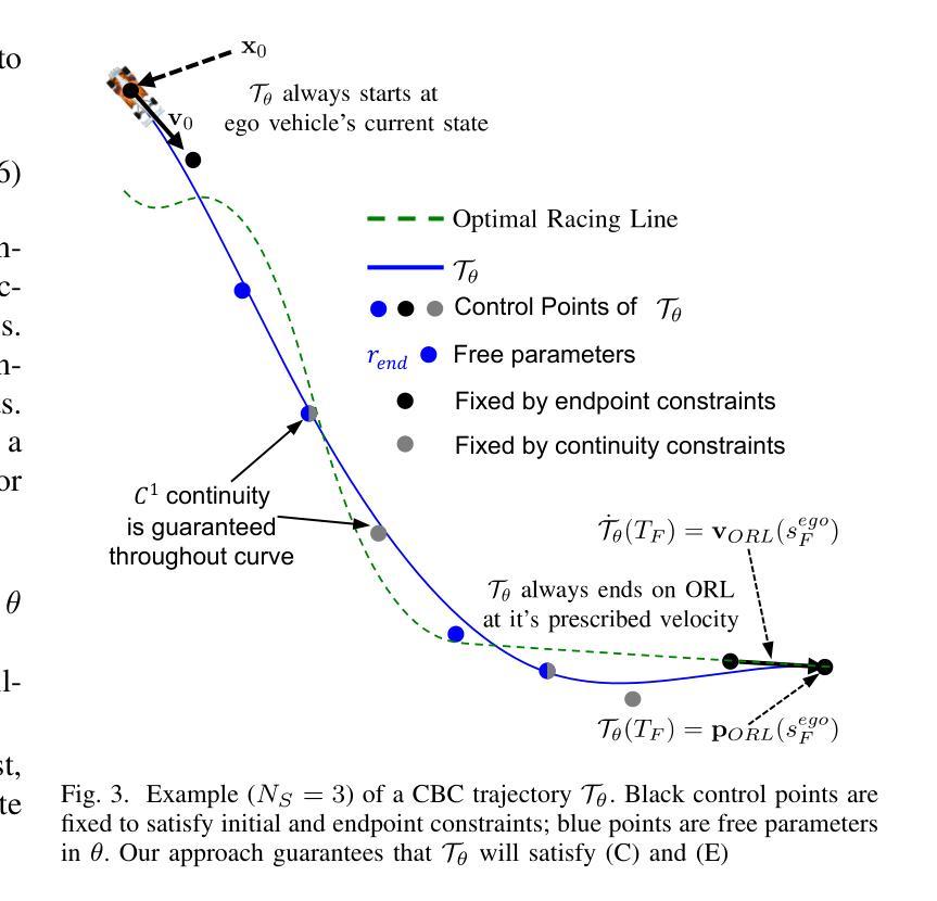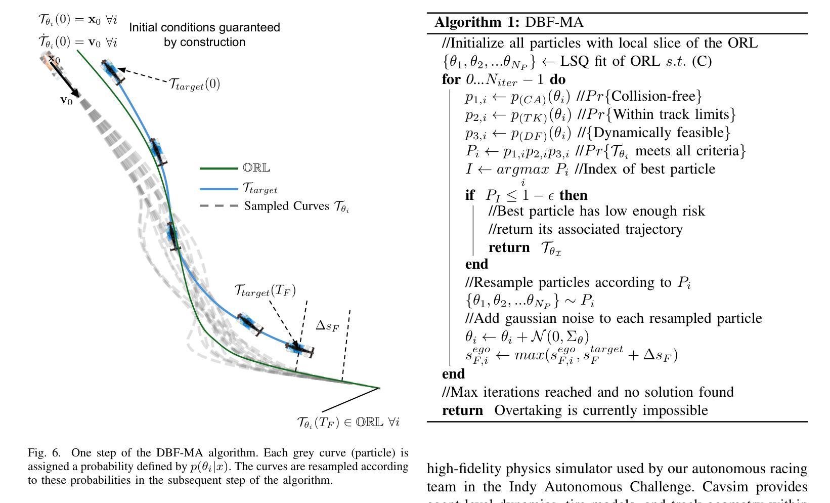 自主赛车领域的一大挑战是生成超车动作。竞赛代理必须在复杂的赛道上执行这些动作,不能有太多失误。虽然已有优化技术和基于图的方法,但这些方法通常在避免碰撞和动态约束方面做了简化的假设。本研究提出了一种基于差分贝叶斯滤波框架的轨迹合成方法。我们的无碰撞轨迹合成方法将问题视为贝叶斯推断在复合贝塞尔曲线空间上的问题。我们的方法无需车辆足迹的球形近似、约束的线性化或在避免碰撞方面的简化上界。我们对DBF-MA进行了闭环分析,发现它在87%的测试场景中成功超越了对手,在自主超车方面优于现有方法。