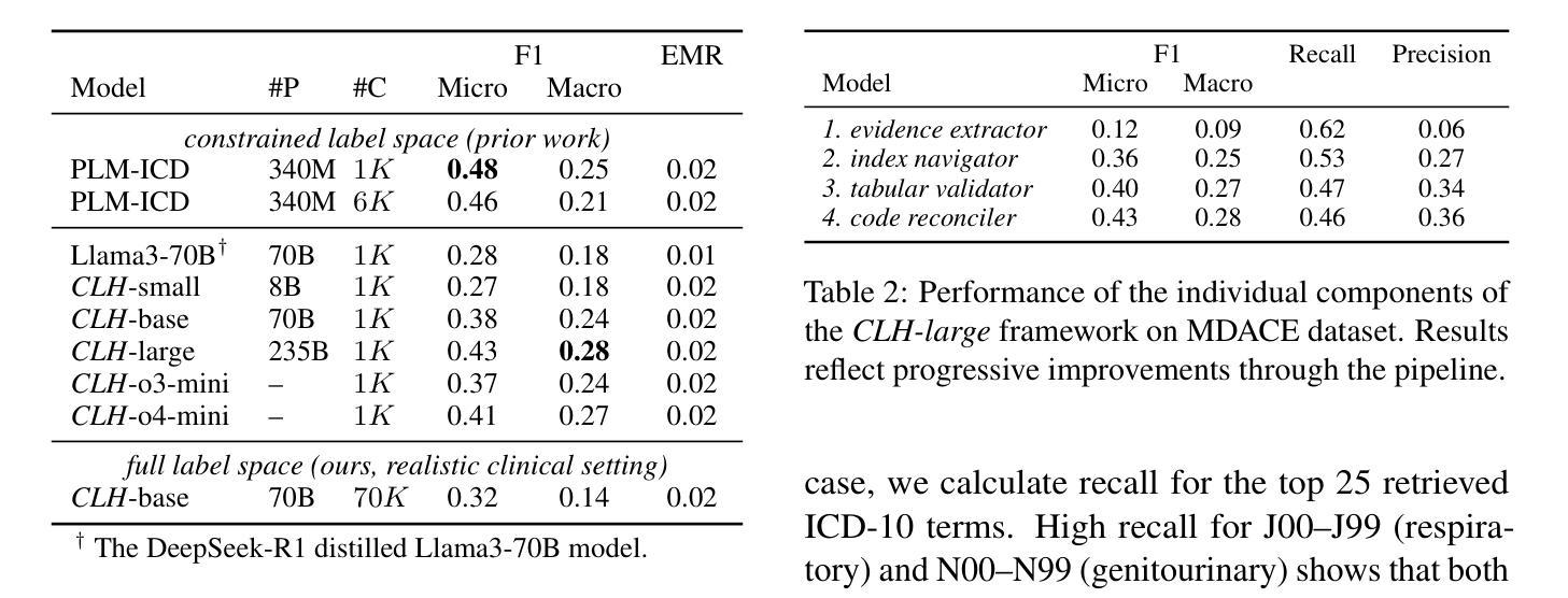 - Code Like Humans在罕见诊断代码的编码上达到了最佳性能。