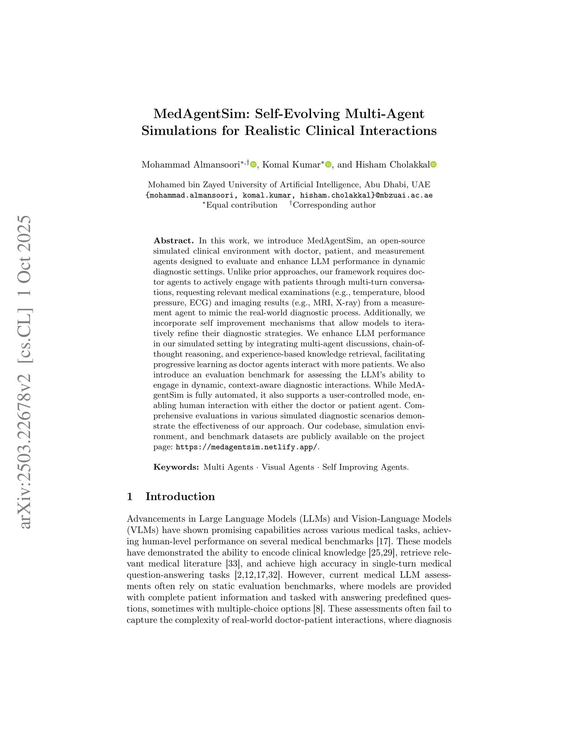 In this work, we introduce MedAgentSim, an open-source simulated clinical environment with doctor, patient, and measurement agents designed to evaluate and enhance LLM performance in dynamic diagnostic settings. Unlike prior approaches, our framework requires doctor agents to actively engage with patients through multi-turn conversations, requesting relevant medical examinations (e.g., temperature, blood pressure, ECG) and imaging results (e.g., MRI, X-ray) from a measurement agent to mimic the real-world diagnostic process. Additionally, we incorporate self improvement mechanisms that allow models to iteratively refine their diagnostic strategies. We enhance LLM performance in our simulated setting by integrating multi-agent discussions, chain-of-thought reasoning, and experience-based knowledge retrieval, facilitating progressive learning as doctor agents interact with more patients. We also introduce an evaluation benchmark for assessing the LLM’s ability to engage in dynamic, context-aware diagnostic interactions. While MedAgentSim is fully automated, it also supports a user-controlled mode, enabling human interaction with either the doctor or patient agent. Comprehensive evaluations in various simulated diagnostic scenarios demonstrate the effectiveness of our approach. Our code, simulation tool, and benchmark are available at \href{https://medagentsim.netlify.app/}.