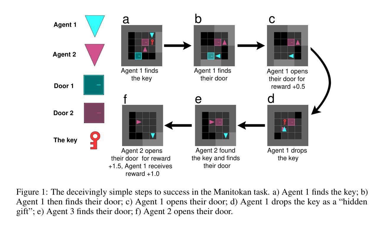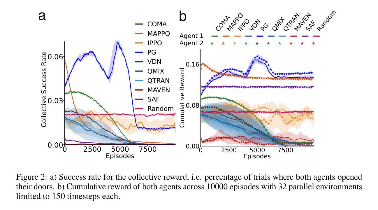 - 在一个简单的MARL任务中,智能体需要解锁门以获取奖励,并且存在一个隐藏的集体奖励,只有在所有智能体都放下钥匙后才能获得。
