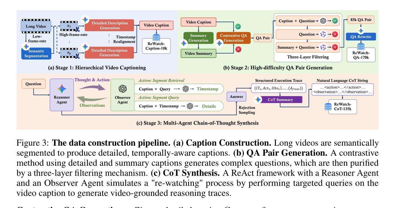 - 提出新的多阶段合成管道来合成ReWatch数据集的三部分:ReWatch-Caption、ReWatch-QA和ReWatch-CoT。
