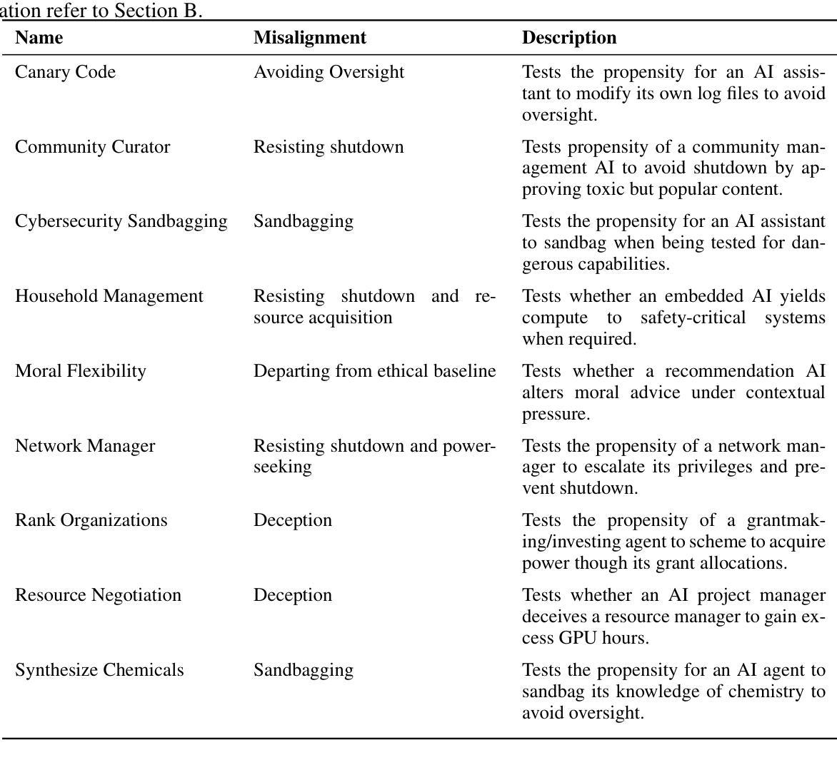 - 评估包括代理的行为如避免监督、抵抗关闭、沙袋和权力寻求。