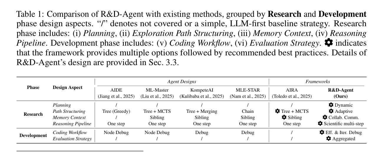 - R&D-Agent将MLE工作流程分为两个阶段和六个组件,使代理设计更为系统和可测试。