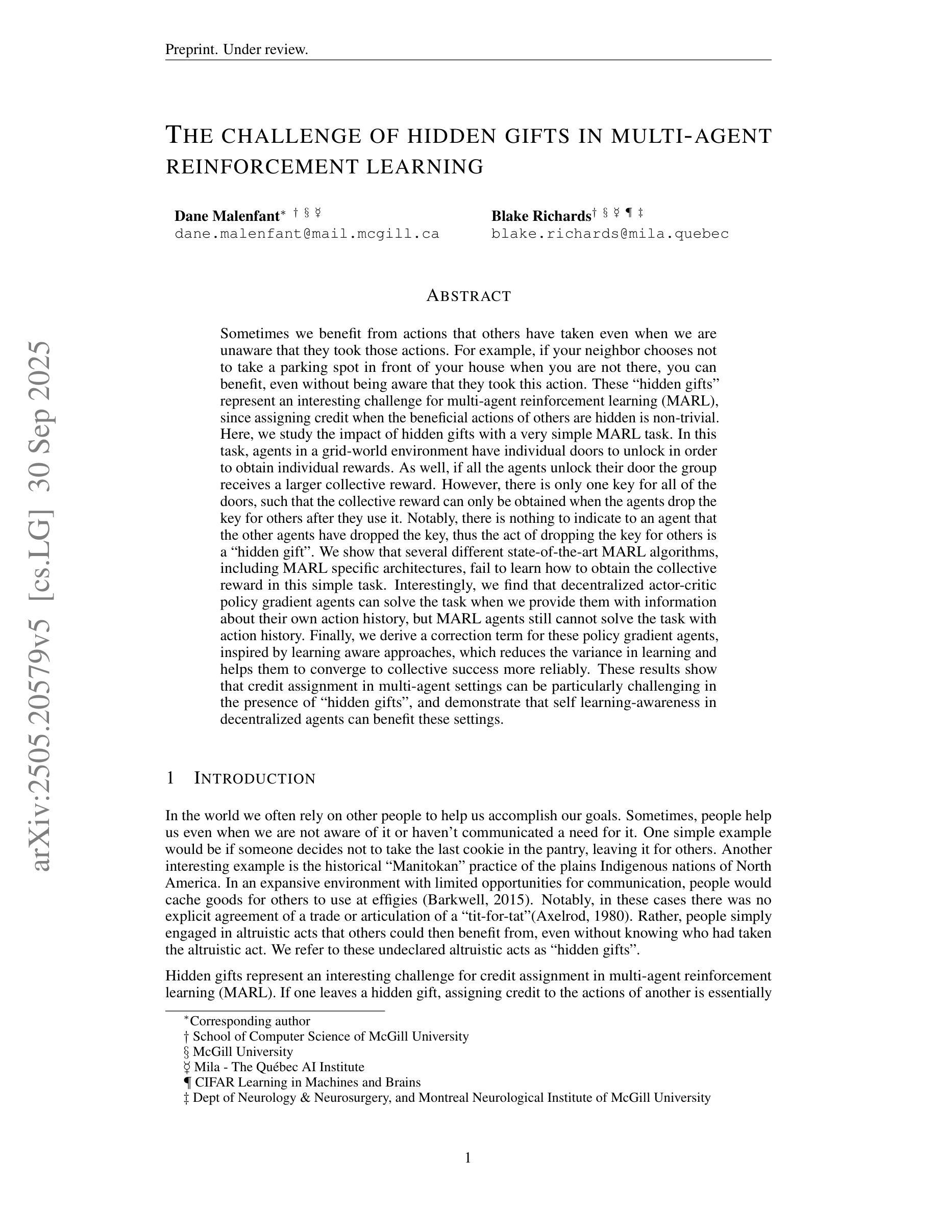 在多人环境中,其他人的行为有时会对我们产生积极影响,即使我们并不知情。在一个简单的多智能体强化学习任务中,智能体在网格世界中需要解锁个人门来获得奖励。若所有智能体都解锁了门,集体将获得更大的奖励。然而,只有一个钥匙可以解锁所有门,智能体在使用钥匙后必须将其放下供他人使用才能带来集体奖励,而这一行为是隐藏的。研究发现,许多先进的MARL算法无法学习如何获得集体奖励,而分散式行动评论家策略梯度智能体在提供自身行动历史信息后可以成功完成任务。最后,受学习意识方法的启发,提出了策略梯度智能体的修正项,以减少学习方差并更可靠地帮助他们实现集体成功。这表明在存在“隐藏礼物”的情况下,多智能体环境中的信用分配尤其具有挑战性,并证明了分散式智能体的自我学习意识可以在这些环境中受益。