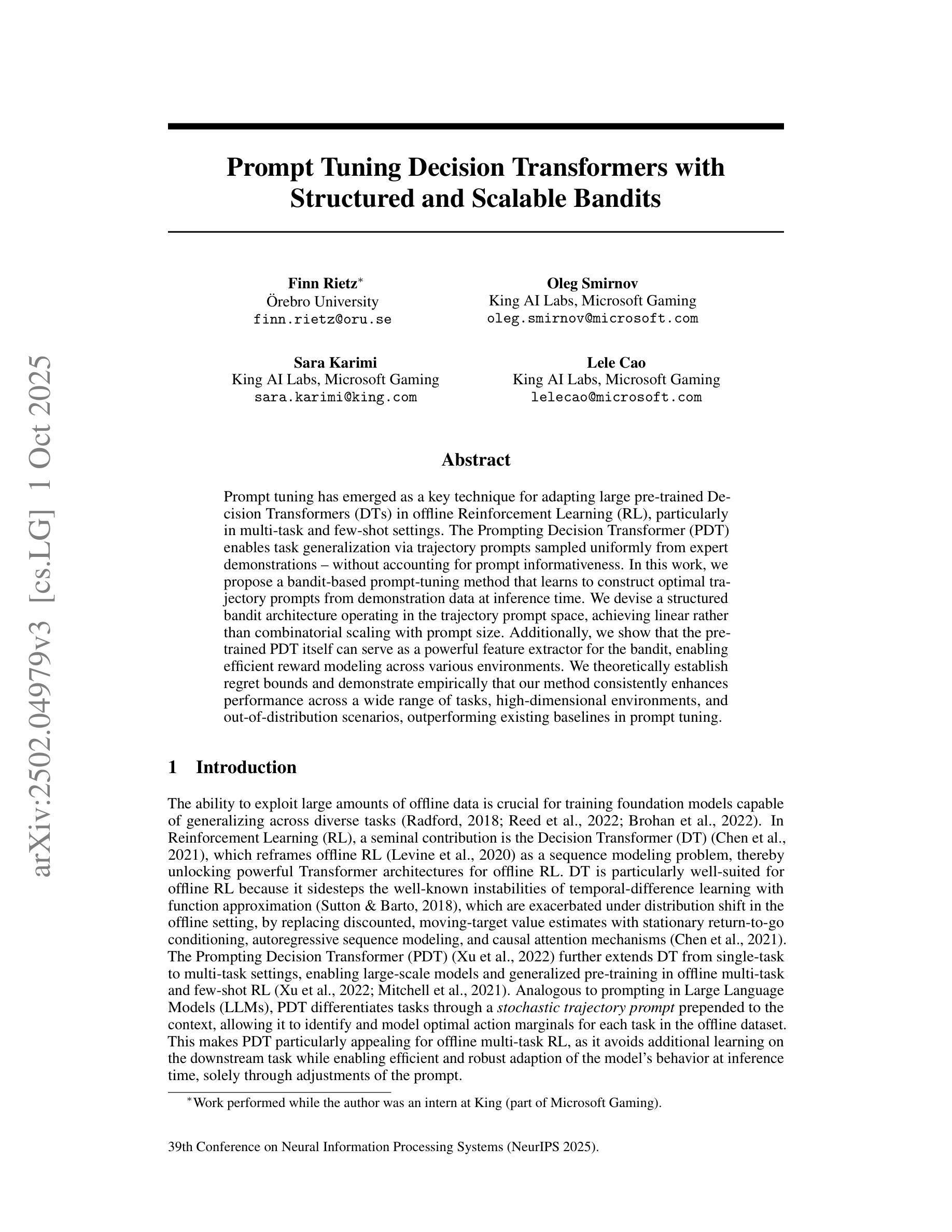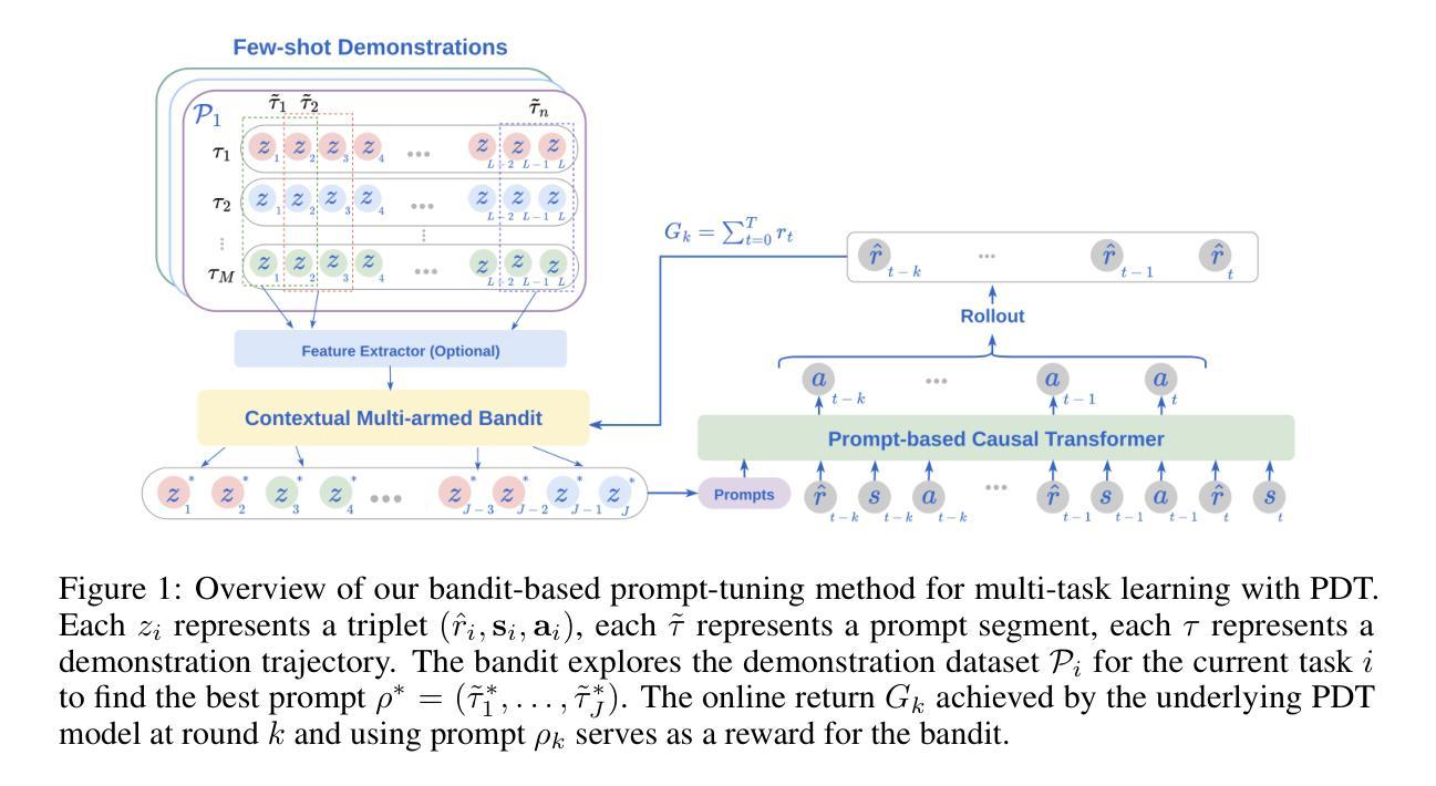 提示调整作为一种关键技术,已经出现在离线强化学习(RL)中,用于适应大型预训练决策转换器(DTs),特别是在多任务和小样本设置中。提示决策转换器(PDT)能够通过从专家演示中均匀采样的轨迹提示来实现任务泛化,而不会考虑提示信息。在这项工作中,我们提出了一种基于强盗的提示调整方法,该方法在推理时间从演示数据中学习构建最优轨迹提示。我们设计了一种在轨迹提示空间中运行的结构化强盗架构,随着提示规模的增长,它实现了线性而不是组合扩展。此外,我们还表明,预训练的PDT本身可以作为强大的特征提取器用于强盗,能够在各种环境中实现有效的奖励建模。我们从理论上建立了后悔界限,并通过实验证明,我们的方法在各种任务、高维环境和超出分布场景中始终提高了性能,在提示调整方面优于现有基线。
