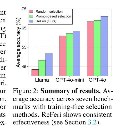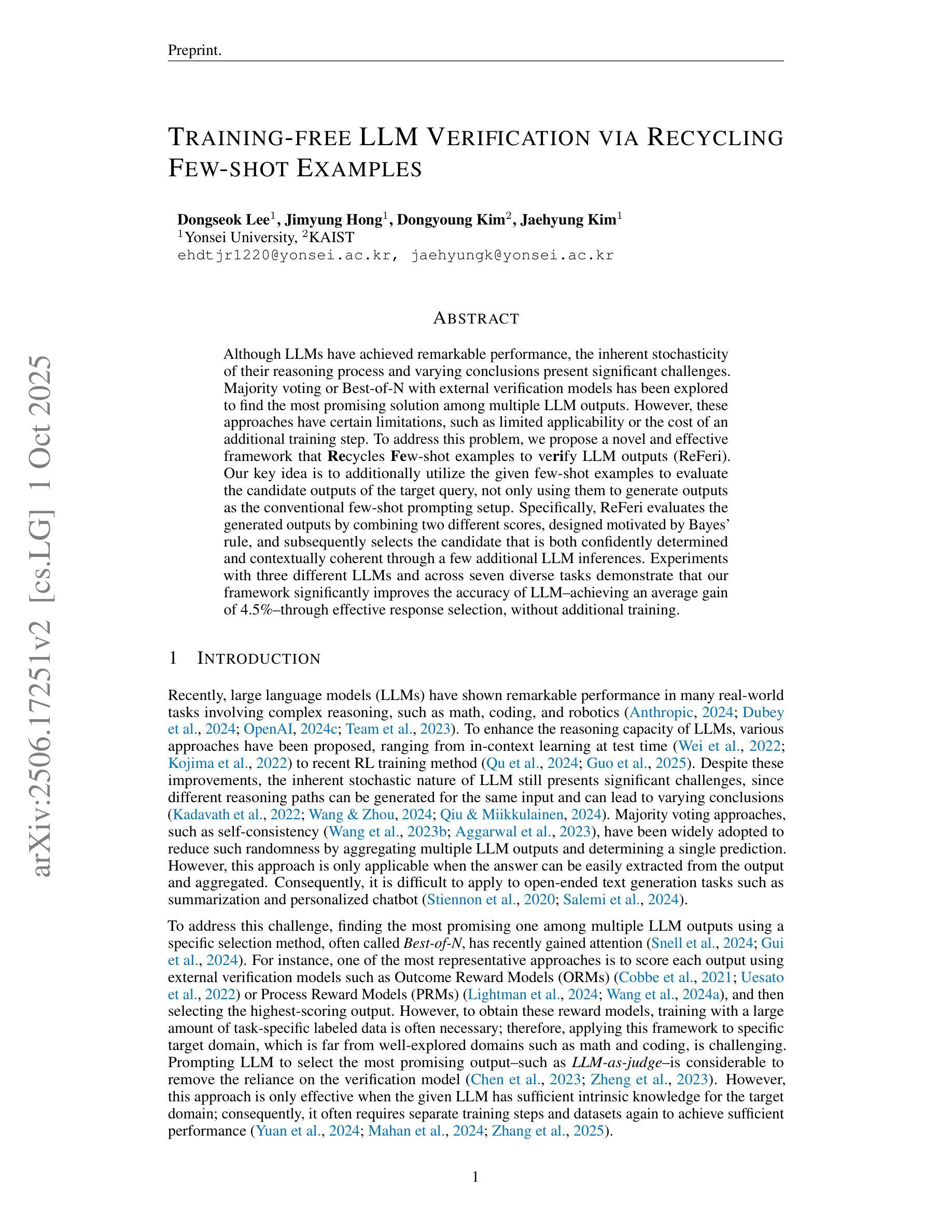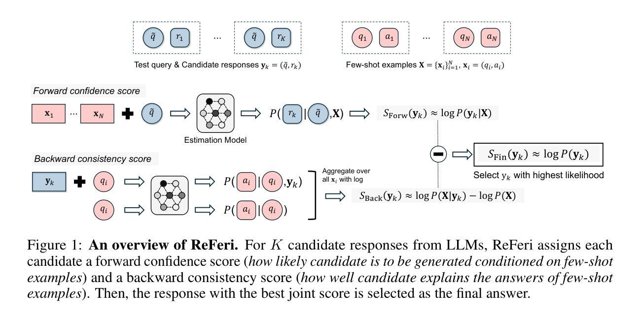 LLMs的推理过程存在固有的随机性和结论多样性,带来挑战。为从多个LLM输出中找到最佳解决方案,人们尝试了多数投票和最佳N选等外部验证模型,但存在局限性。为此,本文提出一种新型框架ReFeri,利用给定的少量示例来评估目标查询的候选输出,不仅用于生成输出。实验表明,ReFeri通过有效的响应选择,在不增加训练成本的情况下,显著提高了LLMs的准确性。