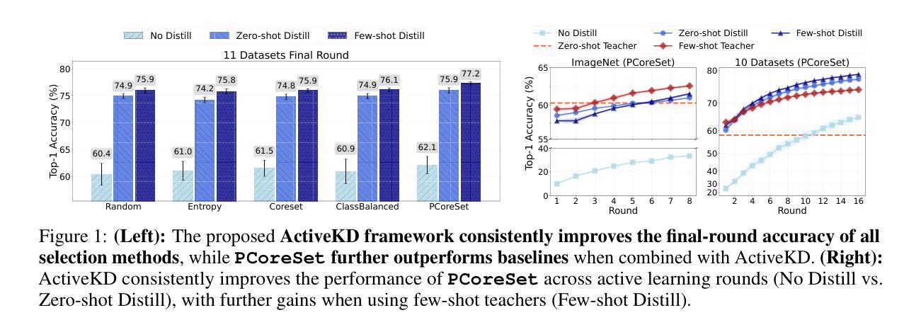 - 在多个数据集上的评估显示,ActiveKD和PCoreSet策略显著提高了性能。