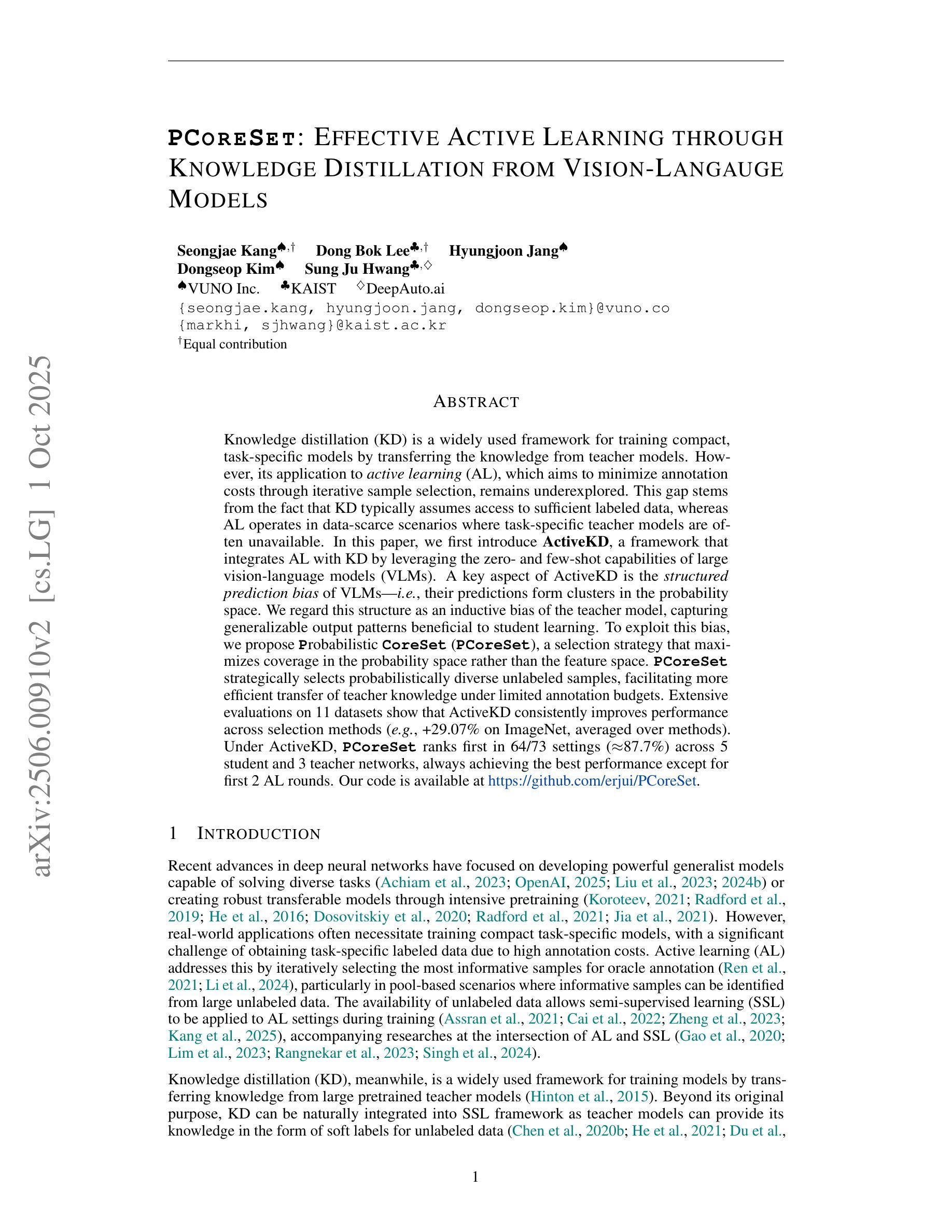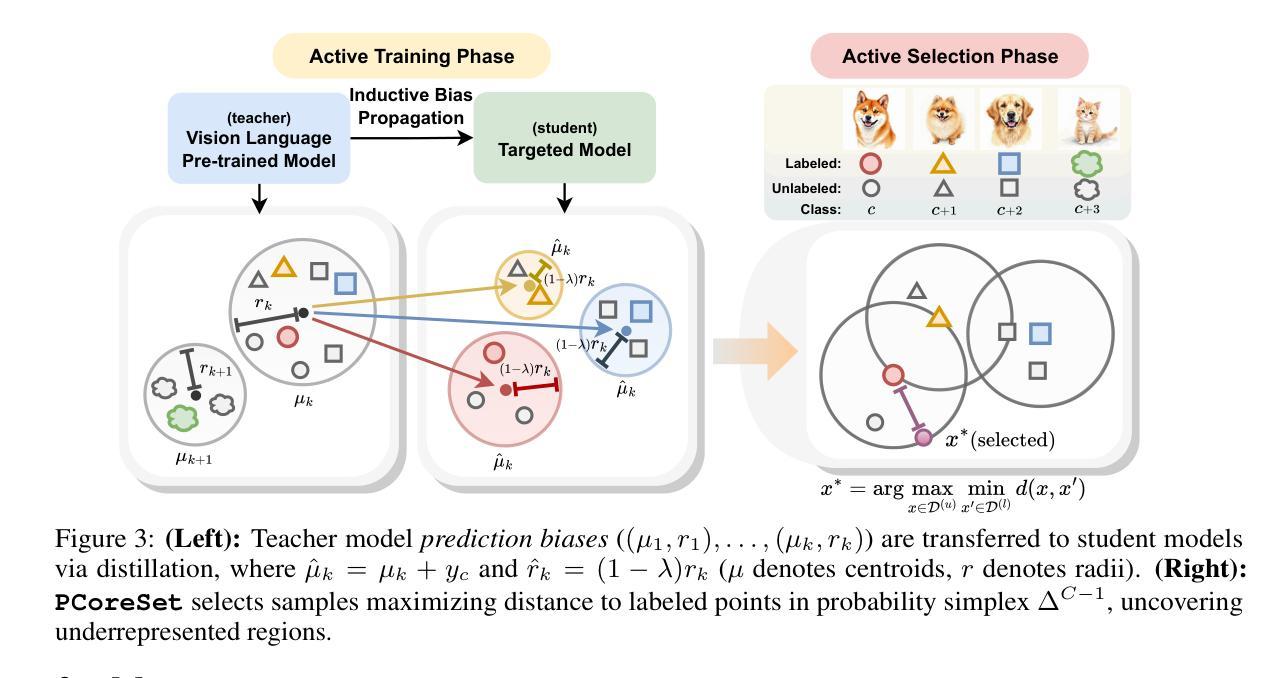 知识蒸馏(KD)是一个广泛应用于通过从教师模型中转移知识来训练紧凑、特定任务的模型的框架。然而,其在主动学习(AL)中的应用仍然被较少探索,主动学习旨在通过迭代样本选择来最小化注释成本。这种差距源于KD通常假设可以访问足够的标记数据,而AL则在数据稀缺的场景中运行,其中特定任务的教师模型通常不可用。在本文中,我们首先介绍了ActiveKD,这是一个将AL与KD相结合的框架,它利用大型视觉语言模型(VLMs)的零样本和少样本能力。ActiveKD的关键方面是VLMs的结构化预测偏差,即它们的预测在概率空间中形成聚类。我们认为这种结构作为教师模型的归纳偏见,捕获了对学生学习有益的通用输出模式。为了利用这种偏见,我们提出了Probabilistic CoreSet(PCoreSet),这是一种选择策略,旨在最大化概率空间中的覆盖率而不是特征空间中的覆盖率。PCoreSet策略性地选择概率上多样化的未标记样本,在有限的注释预算下,更有效地转移教师知识。在11个数据集上的广泛评估表明,ActiveKD在多种选择方法中始终提高了性能(例如在ImageNet上提高了+29.07%,平均在所有方法上)。在ActiveKD下,PCoreSet在73次设置中的前六名中排名第一(约占87.7%),在所有学生网络和教师网络中始终排名第一,除了前两次主动学习回合。我们的代码可在https://github.com/erjui/PCoreSet找到。
