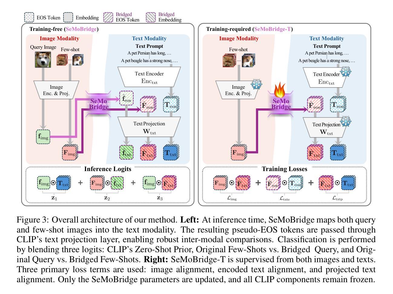 对比语言图像预训练(CLIP)在零样本任务中表现出色,通过对齐图像和文本嵌入,实现优异性能。然而,其在小样本分类方面的表现受到一个关键限制的影响:模态内的不对齐。这一问题由持续的模态差距和CLIP的单一模态间训练目标造成,使得嵌入空间未校准,直接进行图像间比较变得不可靠。现有方法试图通过微调相似性逻辑或计算昂贵的每样本优化来解决这一问题。为了克服这些挑战,我们引入了SeMoBridge,这是一种轻量级但强大的方法,直接解决不对齐问题。我们的方法将图像映射到文本模态,同时通过我们所谓的语义模态桥保持其语义内容完整。SeMoBridge是封闭形式的,可以通过多模态监督进行可选训练,结合图像和文本对齐损失来优化投影。实验表明,经过训练的SeMoBridge-T版本仅需一小部分训练时间,总体上优于其他方法,特别是在低数据场景(1、2和4个样本)下表现更出色。代码可在https://github.com/christti98/semobridge找到。