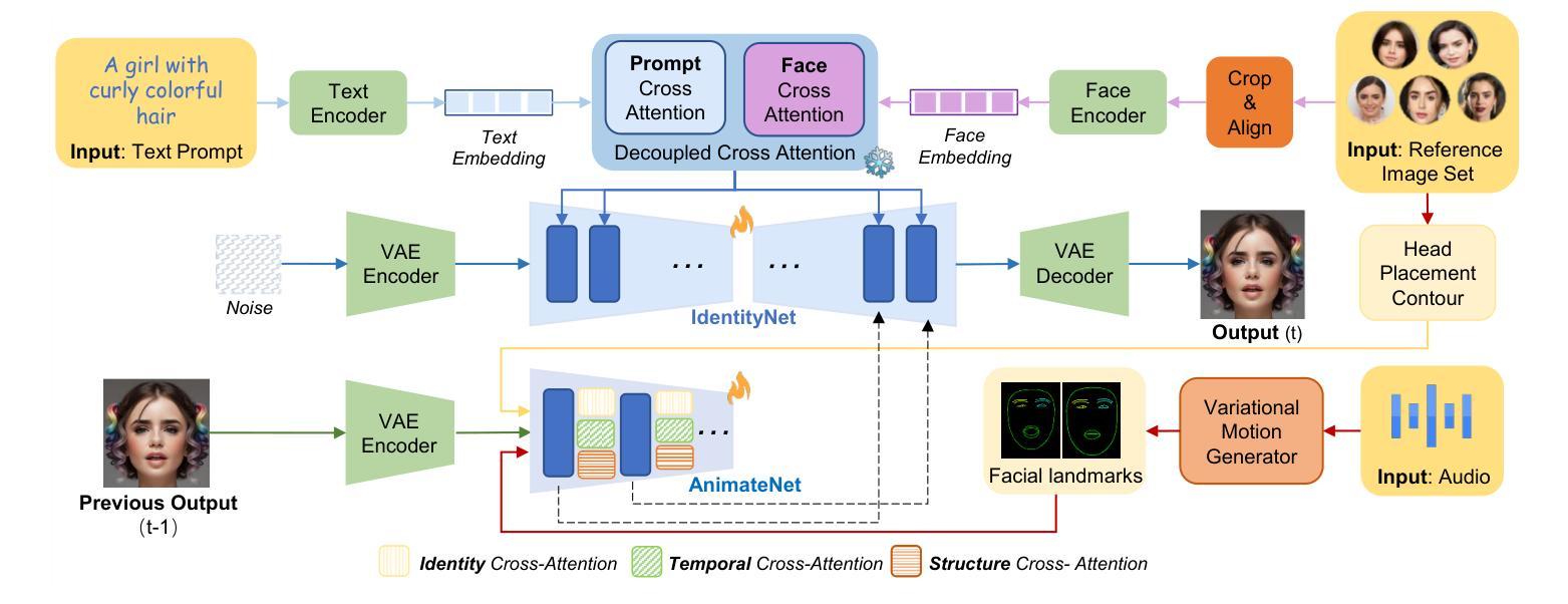 - 该框架利用潜在扩散模型,包括IdentityNet和AnimateNet,分别注重身份特征保持一致和运动连贯性。