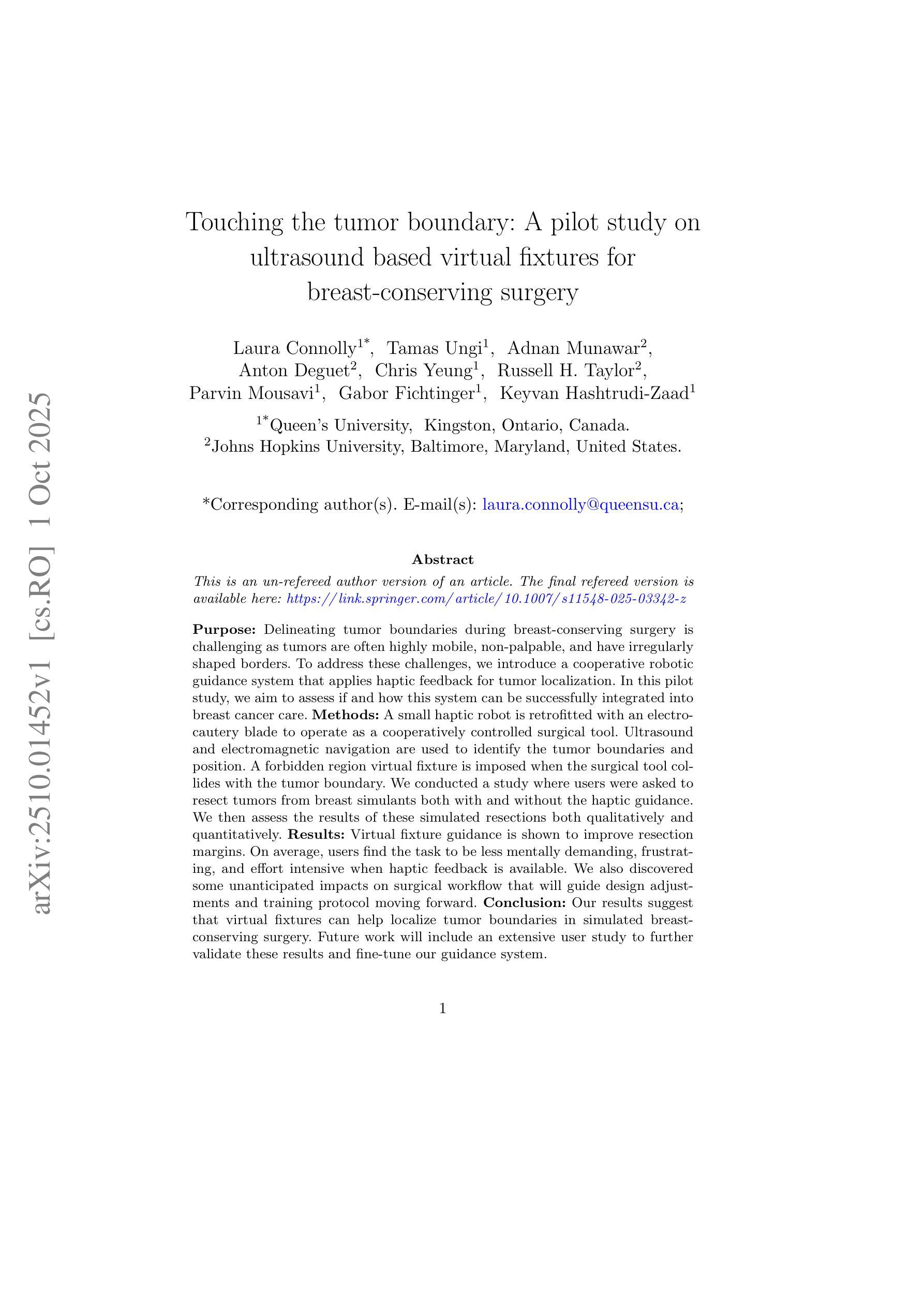 本文介绍了一种用于乳腺癌保乳手术中的合作机器人引导系统,该系统采用触觉反馈来定位肿瘤。在一项试点研究中,作者评估了该系统在模拟乳房切除手术中的表现,发现虚拟夹具指导可以改善切除边界,并降低了用户的心理需求和操作难度。尽管存在一些未预见的影响,但作者认为该系统的引入具有潜力,未来还需进行更多的用户研究来验证并优化该系统。