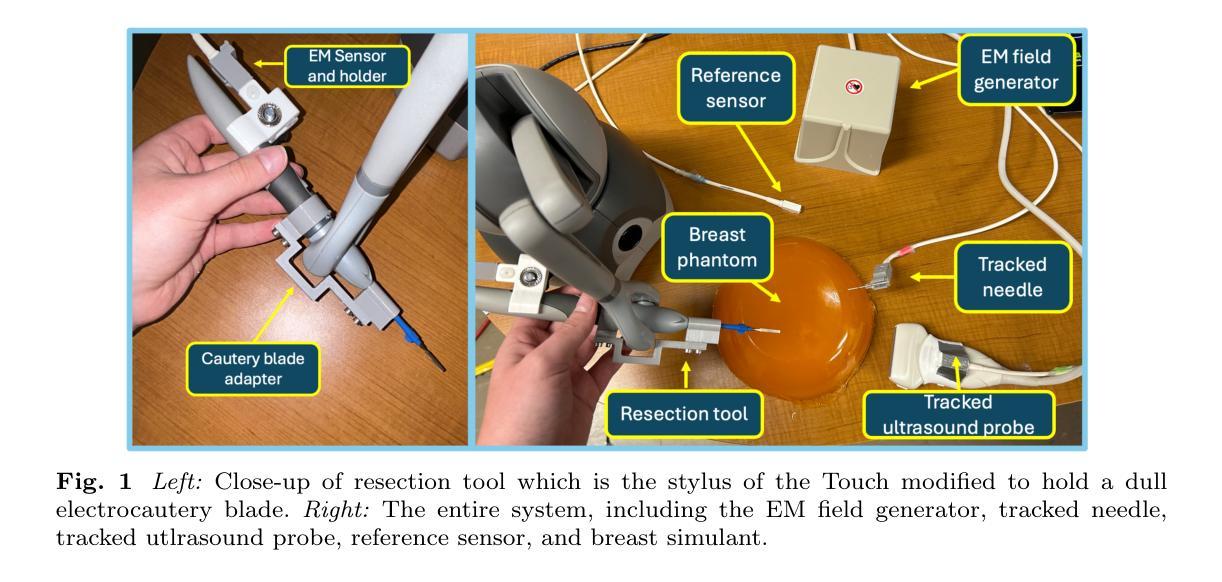 方法:小型触觉机器人被改装成带有电灼刀的手术工具,以实现合作控制。超声和电磁导航被用来识别肿瘤边界和位置。当手术工具碰到肿瘤边界时,系统会实施一个禁止区域虚拟装置。我们进行了一项研究,要求参与者在带有和不带触觉引导的条件下,从乳房模拟物中切除肿瘤。然后,我们定性和定量地评估这些模拟切除的结果。