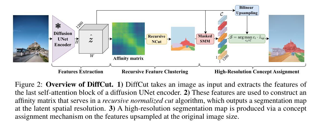 跨语言、视觉和多模态任务等多个领域,基础模型已成为强大的工具。虽然先前的研究已经解决了无监督图像分割的问题,但它们显著落后于监督模型。在本文中,我们使用扩散UNet编码器作为基础视觉编码器,并引入了DiffCut,这是一种无监督零样本分割方法,它仅利用最终自注意块输出的特征。通过广泛的实验,我们证明了在基于图的分割算法中使用这些扩散特征,在零样本分割方面显著优于以前的最先进方法。具体来说,我们利用递归规范化切割算法,该算法可以轻柔地调节检测到的对象的粒度,并产生定义明确的分割图,能够精确捕捉图像细节。我们的工作突出了扩散UNet编码器中嵌入的非常精确语义知识,然后可以作为下游任务的基础视觉编码器。项目页面为:https://diffcut-segmentation.github.io 。