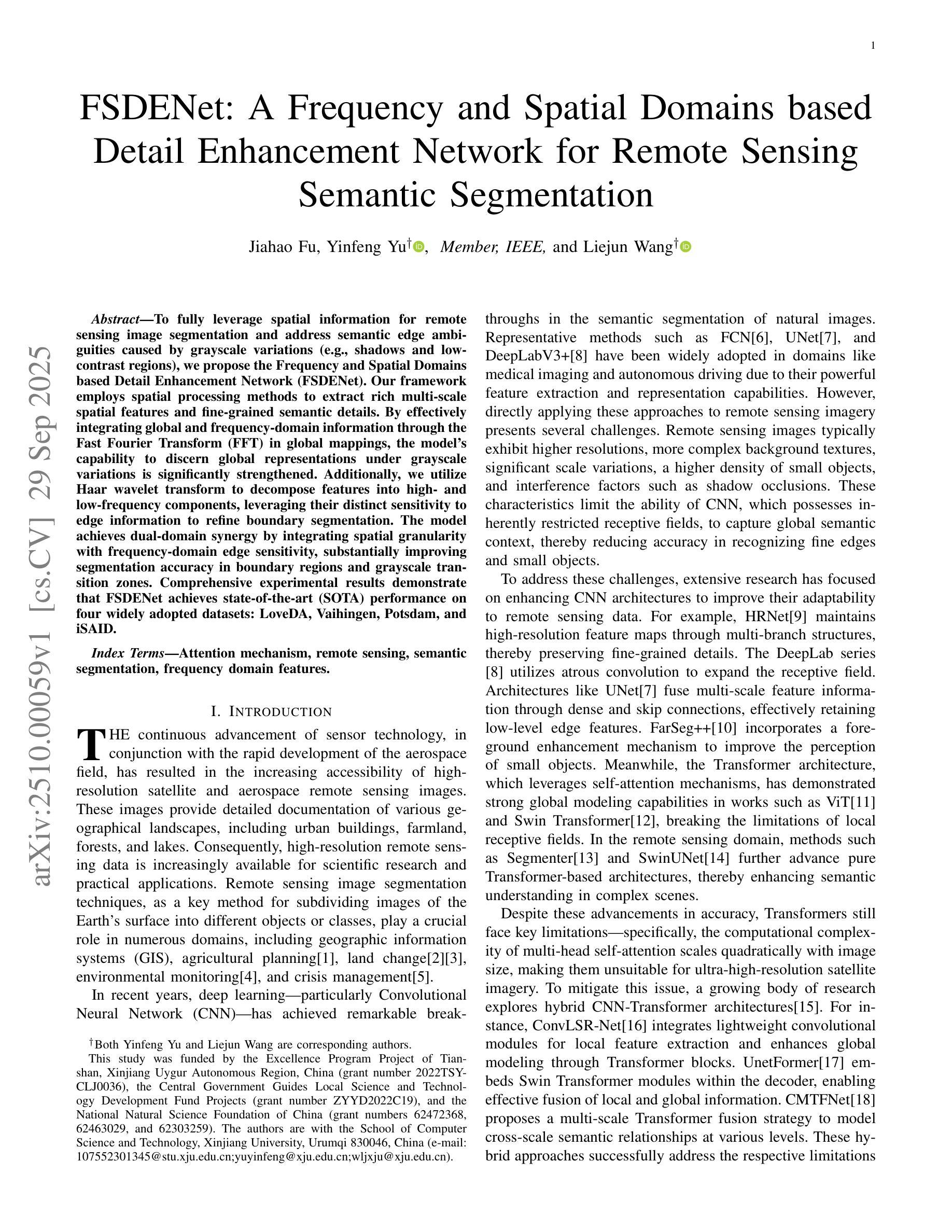 为了充分利用遥感图像分割中的空间信息,并解决由灰度变化(如阴影和低对比度区域)引起的语义边缘模糊问题,我们提出了基于频率和空间域的细节增强网络(FSDENet)。我们的框架采用空间处理方法来提取丰富的多尺度空间特征和精细的语义细节。通过全局映射中的快速傅里叶变换(FFT)有效整合全局和频域信息,模型在灰度变化下辨别全局表示的能力得到显著增强。此外,我们利用Haar小波变换将特征分解为高频和低频成分,利用其对不同边缘信息的不同敏感性来优化边界分割。该模型通过整合空间粒度和频域边缘敏感性,实现了双域协同,极大地提高了边界区域和灰度过渡区的分割精度。全面的实验结果表明,FSDENet在四个广泛采用的数据集LoveDA、Vaihingen、Potsdam和iSAID上达到了最先进的性能。