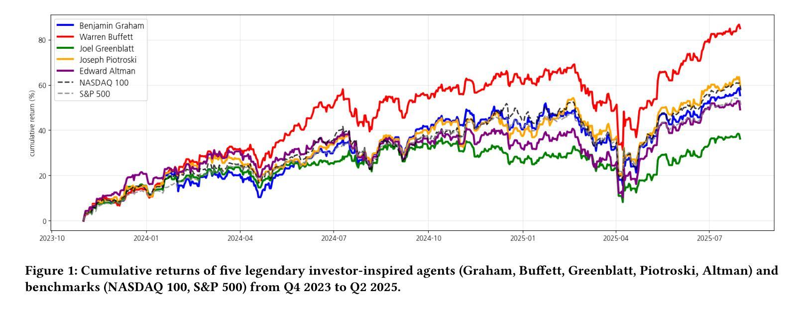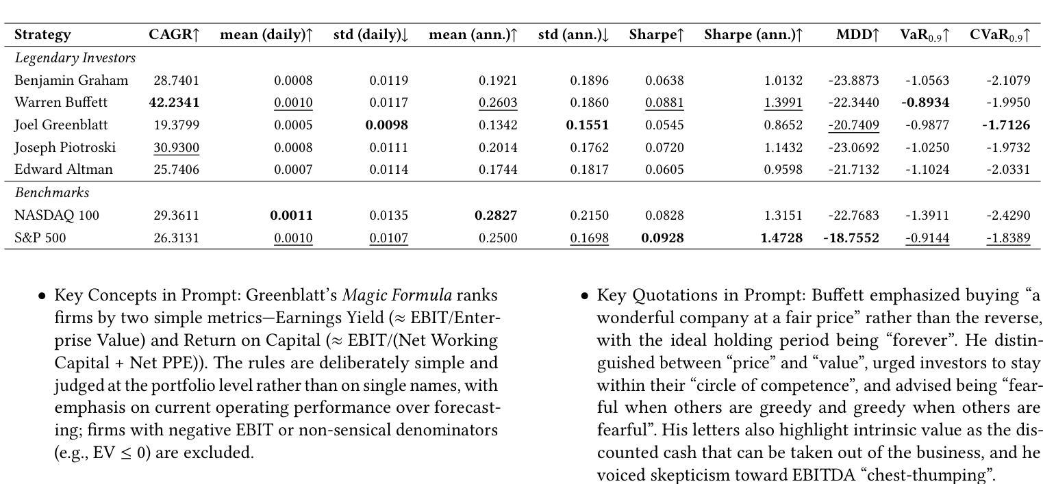 本文展示了GuruAgents(提示引导的人工智能代理)如何系统地运用传奇投资大师的策略。通过编码五位标志性投资者的独特哲学思想,开发出五个不同的GuruAgents。在一个关于纳斯达克100成分股的回测中,这些GuruAgents表现出了独特的行为特点,巴菲特GuruAgent表现最为出色,取得了高投资回报率,成功实现了预期的投资目标。这项研究证明了提示工程能够成功地将投资大师的定性哲学转化为可复制的定量策略,为自动化系统性投资提供了新颖的方向。源码和数据可在GitHub上找到。