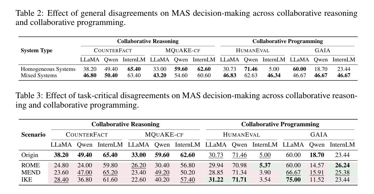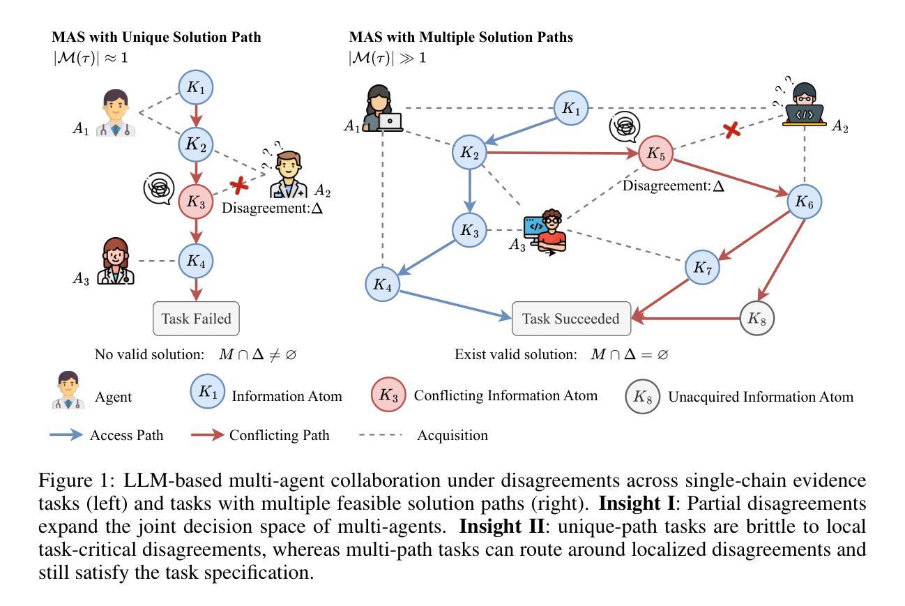 最近大型语言模型(LLM)的进步使其从复杂的文本生成器升级为能够在多智能体系统(MAS)中进行合作和使用工具的自主动剂。然而,尚不清楚分歧如何影响集体决策。本文重新审视了分歧的作用,并认为普遍存在的部分重叠分歧能防止过早达成共识并扩大探索的解空间,而关于任务关键步骤的分歧可能会根据解决方案路径的拓扑结构阻碍协作。我们研究了两种具有不同路径结构的协作环境:通常遵循单一证据链的协作推理(CounterFact、MQuAKE-cf),以及通常采用多种有效实现的协作编程(HumanEval、GAIA)。分歧被实例化为智能体之间的普遍异质性,以及注入上下文或参数中的任务关键反事实知识编辑。实验表明,普遍的分歧通过鼓励互补探索来持续提高成功率。相比之下,任务关键的分歧会极大地减少单一路径推理的成功率,但对编程的影响有限,因为智能体可以选择替代解决方案。轨迹分析显示,MAS在编程中会经常绕过编辑的事实,但在推理中很少这样做,这表明出现了一种依赖解决方案路径而非单一规模的自我修复能力。我们的代码可从 https://github.com/wbw6e利用查看。