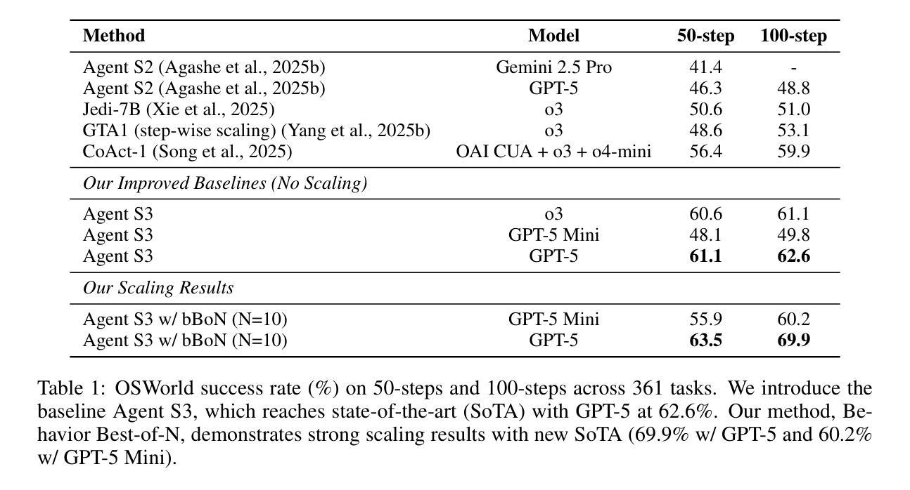 - 在OSWorld上,bBoN方法达到新的最佳性能,接近人类水平。