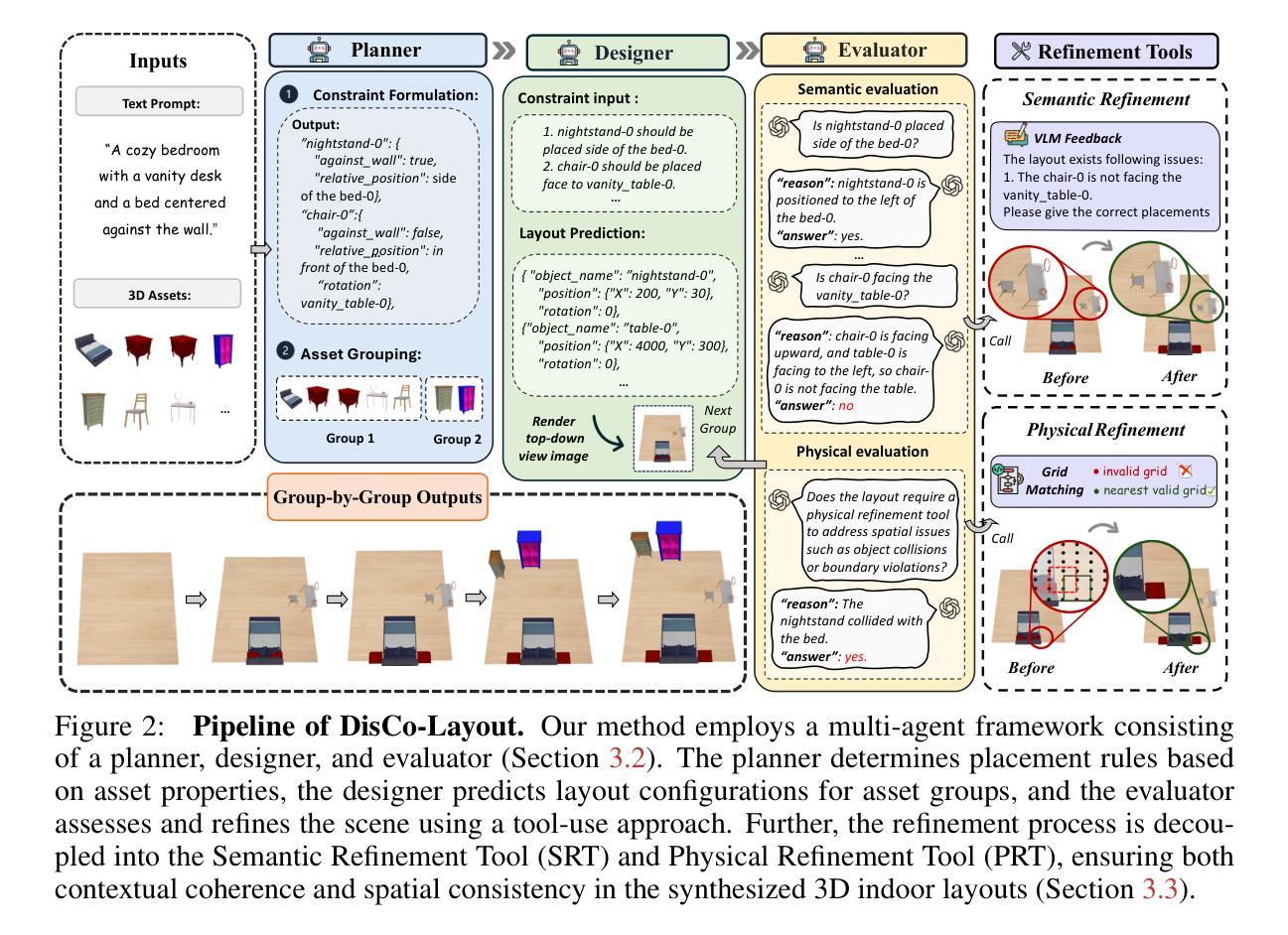 本文介绍了室内三维布局合成的重要性及其对虚拟环境创建的影响。传统的合成方法受限于固定数据集,难以实现泛化。最近基于LLM和VLM的方法虽然提高了语义丰富性,但在灵活性和鲁棒性方面存在不足,导致布局结果不尽人意。本文提出了一种新型框架DisCo-Layout,该框架能够分离和协调物理和语义的修正,包括独立的修正和协作的修正。独立的修正通过语义修正工具(SRT)和物理修正工具(PRT)实现,分别负责纠正抽象对象关系和解决具体的空间问题。协作修正则通过一个多智能体框架进行工具的智能编排,包括放置规则规划器、初始布局设计师和评估器。实验证明,DisCo-Layout在生成真实、连贯、泛化的室内三维布局方面具有领先水平。