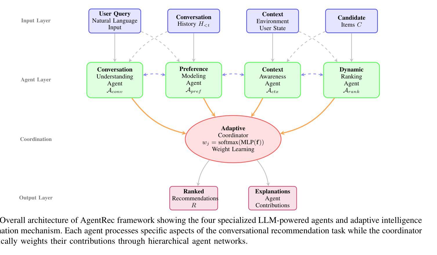 交互式对话推荐系统可通过自然语言交互捕捉用户偏好,备受关注。然而,现有方法在处理动态用户偏好、保持对话连贯性和平衡多个排名目标方面面临挑战。本文提出AgentRec,一种基于大型语言模型(LLM)驱动的多智能体协作推荐框架,通过分层智能体网络自适应智能解决这些问题。该方法采用专门的大型语言模型驱动的智能体进行对话理解、偏好建模、上下文感知和动态排名,通过自适应加权机制协调,该机制从交互模式中学习。我们提出了一种三层学习策略,结合快速响应简单查询、智能推理复杂偏好和深度协作应对挑战场景。在三个真实数据集上的广泛实验表明,AgentRec较最新基线技术实现了一致改进,对话成功率提高2.8%,推荐准确性(NDCG@10)提高1.9%,对话效率提高3.2%,同时通过智能协调保持相当的计算成本。