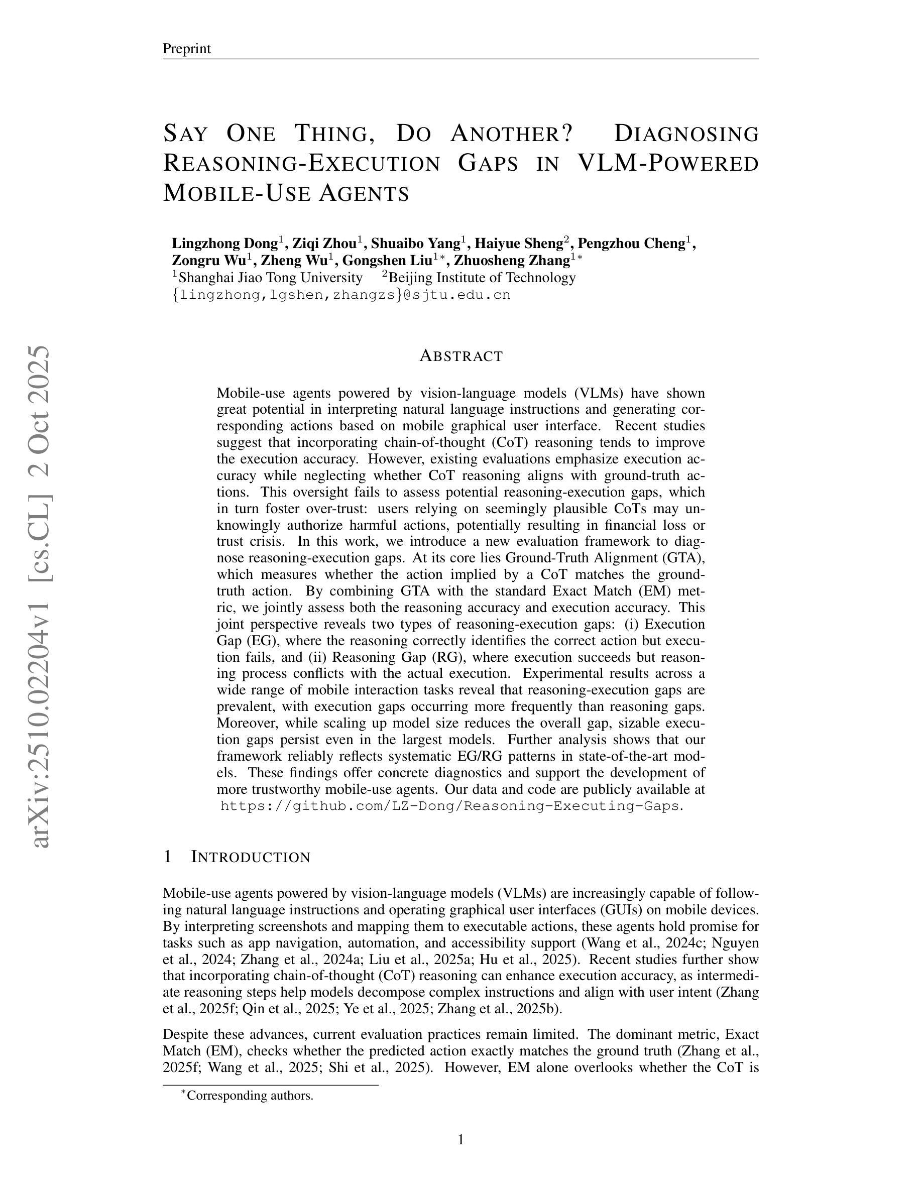 由视觉语言模型(VLMs)驱动的使用代理(agent)在手机图形用户界面上解释自然语言指令并生成相应的行动方面显示出巨大的潜力。最近的研究表明,融入思维链(CoT)推理可以提高执行准确性。然而,现有的评估强调执行准确性,却忽略了CoT推理是否与真实行动一致。这种忽视无法评估潜在的推理执行差距,这反过来又可能导致过度信任:用户可能会依赖看似合理的CoT而无意中授权有害行为,可能导致财务损失或信任危机。在这项工作中,我们引入了一个新的评估框架来诊断推理执行差距。其核心在于地面真实对齐(GTA),它衡量的是由CoT暗示的行动是否与地面真实行动相符。通过将GTA与标准的精确匹配(EM)指标相结合,我们共同评估了推理准确性和执行准确性。这种联合视角揭示了两种类型的推理执行差距:(i)执行差距(EG),即推理正确地识别了正确的行动,但执行失败;(ii)推理差距(RG),即执行成功但推理过程与实际执行相冲突。在广泛的移动交互任务上的实验结果表明,推理执行差距普遍存在,执行差距比推理差距更频繁地发生。而且,虽然扩大模型规模会减少总体差距,但在大型模型中仍然存在相当大的执行差距。进一步的分析表明,我们的框架可靠地反映了最先进模型中的系统性EG/RG模式。这些发现提供了具体的诊断支持,并有助于开发更值得信赖的移动使用代理。