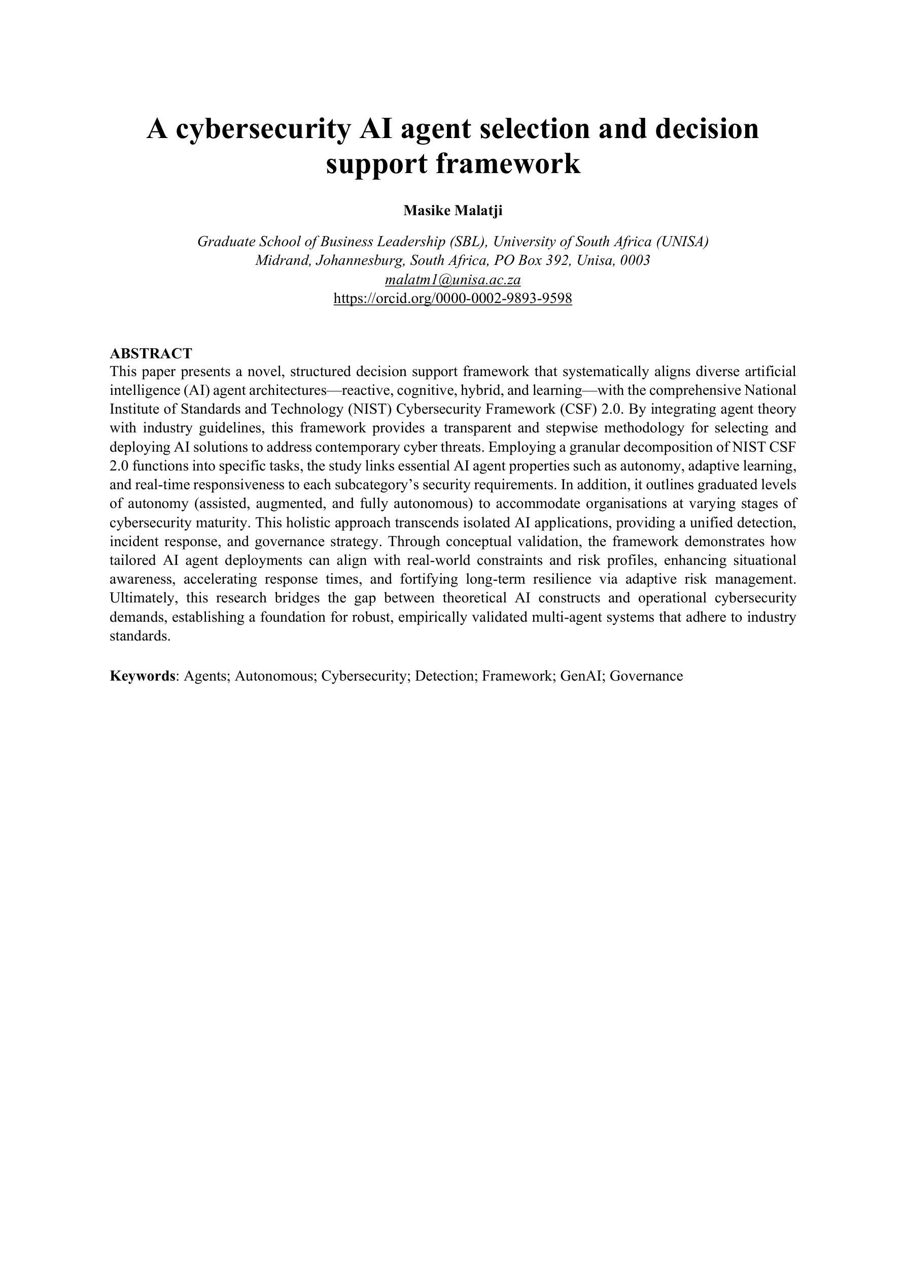 - 该框架通过整合代理理论与行业标准,提供了一种选择并部署AI解决方案以应对网络安全威胁的透明且分步的方法。