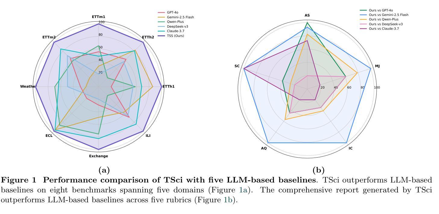 - 在多个基准测试上,TSci表现出卓越的性能,显著优于统计和LLM基线方法。