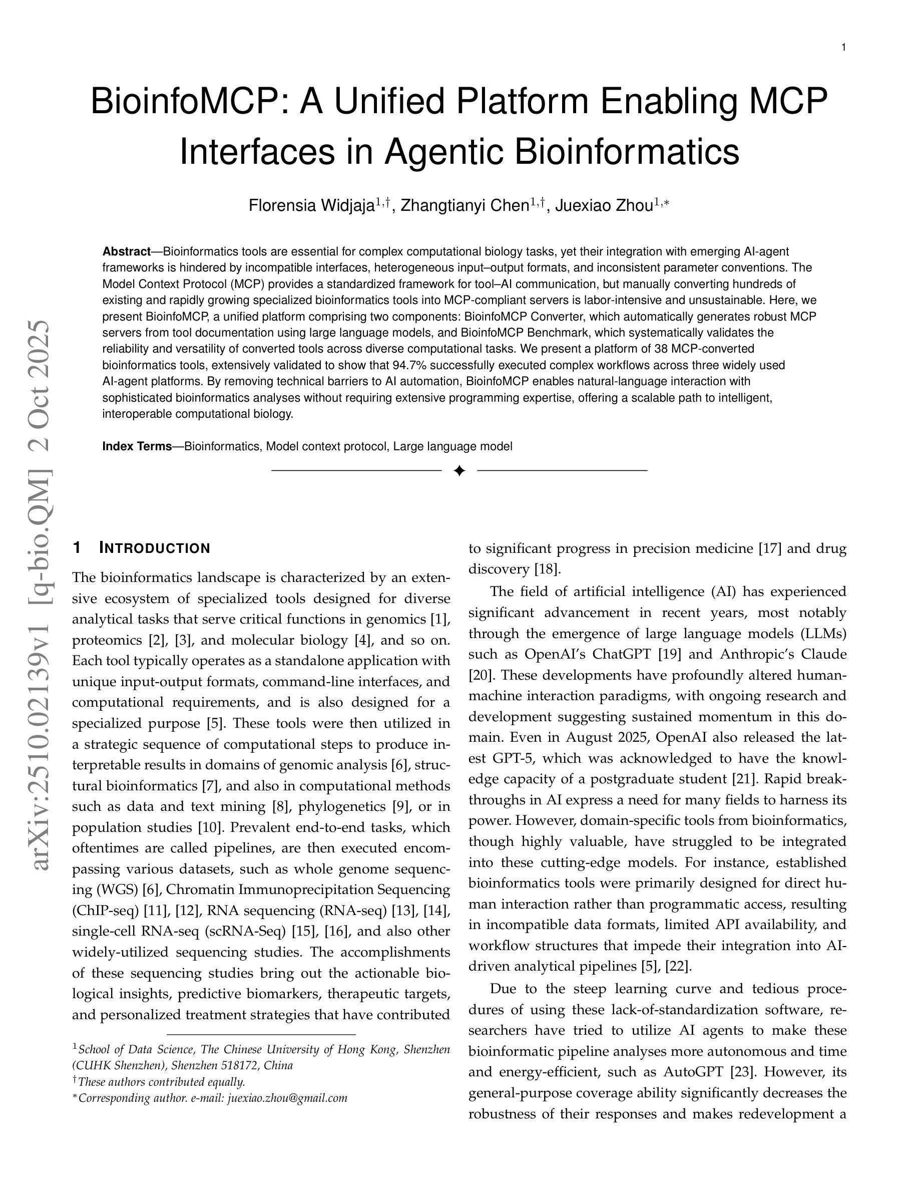 生物信息学工具对于复杂的计算生物学任务至关重要,但其与新兴的AI代理框架的集成受到不兼容接口、异构的输入输出格式和参数约定不一致的阻碍。模型上下文协议(MCP)为工具与人工智能之间的通信提供了标准化框架,但手动将大量现有的和快速增长的专业生物信息学工具转换为MCP兼容服务器是劳动密集型的,且不可持续。本文介绍BioinfoMCP统一平台,包括两个组件:BioinfoMCP转换器,利用大型语言模型自动从工具文档中生成稳健的MCP服务器;BioinfoMCP基准测试系统,系统地验证转换工具在不同计算任务中的可靠性和通用性。本文展示了38个MCP转换的生物信息学工具平台,广泛验证表明,94.7%的工具成功地在三个广泛使用的AI代理平台上执行了复杂的工作流。通过消除人工智能自动化的技术障碍,BioinfoMCP实现了与高级生物信息学分析的自然语言交互,无需广泛的编程专业知识,为智能、可互操作的计算生物学提供了可扩展的路径。