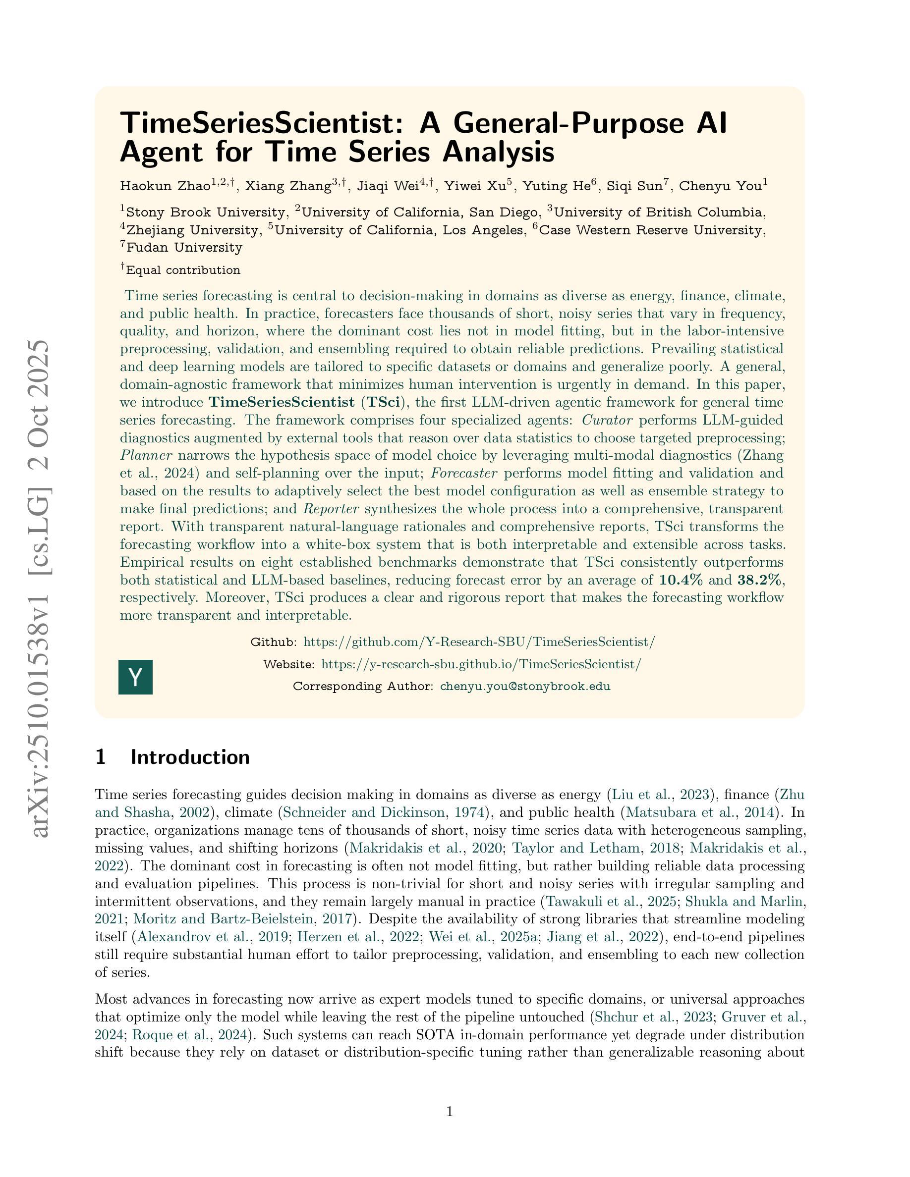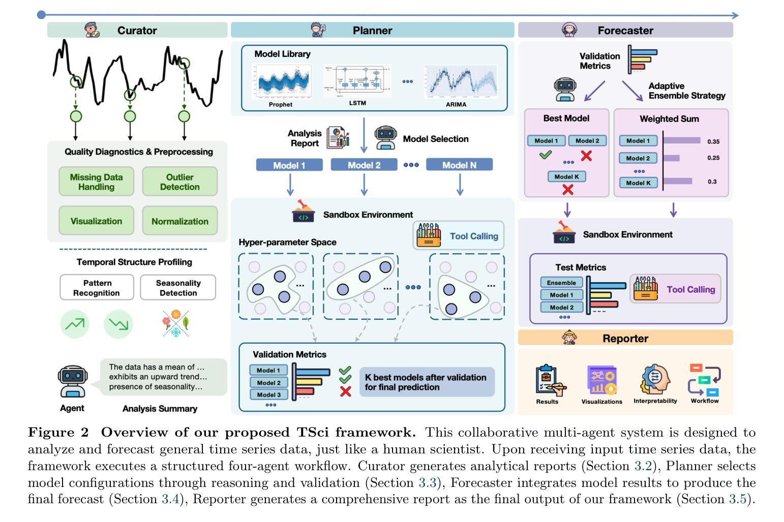 时间序列预测在不同领域如能源、金融、气候和公共卫生中的决策制定中占据核心地位。在实践中,预测者面临成千上万短暂且嘈杂的数据序列,这些数据序列在频率、质量和时间范围上各不相同,主要成本不在于模型拟合,而在于获得可靠预测所需的劳动密集型的预处理、验证和集成过程。流行的统计和深度学习模型针对特定数据集或领域定制,其泛化能力较差。迫切需要一种通用的、独立于领域的框架,以最小化人工干预。本文介绍了一种名为TimeSeriesScientist(TSci)的LLM驱动的时间序列预测框架,该框架包含四个专门代理:Curator使用LLM引导的诊并在选择针对性预处理时运用外部工具来合理分析数据统计学;Planner通过利用多模式诊断和自我规划选择缩小模型选择假设空间;Forecaster进行模型拟合和验证并根据结果自适应地选择和最终预测的最佳模型配置和集成策略;Reporter将整个流程整合成综合的透明报告。TSci以透明的自然语言理由和全面的报告将预测工作流程转化为一个透明、可解释且可跨任务扩展的白盒系统。在八个基准测试上的实证结果表明,TSci在统计和LLM基准测试上表现优越,平均减少预测误差分别为10.4%和38.2%。此外,TSci生成清晰严格的报告使预测工作流程更加透明和可解释。