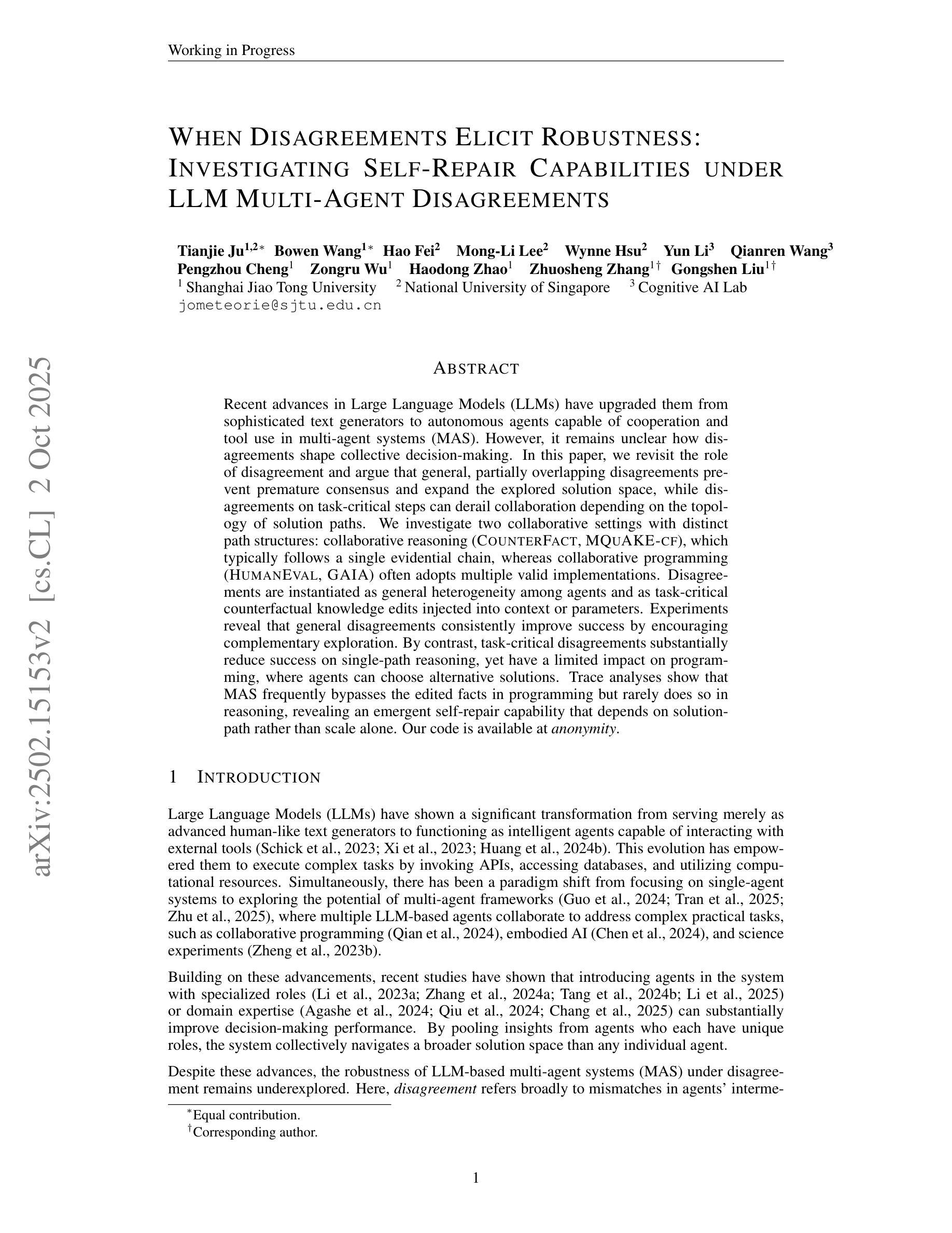 近期大型语言模型(LLM)的进步使其从高级文本生成器升级为具备协作和工具使用能力的多智能体系统(MAS)。本文探讨了分歧在集体决策中的角色,认为普遍性的部分重叠分歧能防止过早达成共识并扩大解决方案的探索空间,而针对任务关键步骤的分歧可能会破坏协作,这取决于解决方案路径的拓扑结构。实验表明,一般性分歧通过鼓励互补性探索来持续提高成功率。相比之下,任务关键分歧对单一路径推理的成功率产生较大负面影响,但对编程的影响有限。分析显示,MAS在编程时经常绕过修改的事实,而在推理时则很少这样做,显示出一种新兴的自我修复能力,这取决于解决方案路径而不是规模本身。