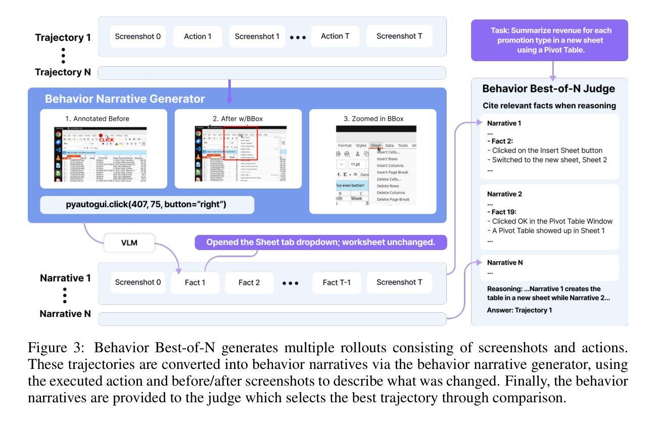 计算机使用代理(CUAs)在自动化日常数字任务上具有潜力,但其可靠性和高方差的问题限制了它们在长期复杂任务中的应用。我们引入了行为最佳N(bBoN)方法,它通过生成多个回滚并选择描述代理回滚的行为叙事来扩展多个代理。它实现了广泛的探索和原则性的轨迹选择,显著提高了鲁棒性和成功率。在OSWorld上,我们的bBoN扩展方法建立了新的最佳状态,达到69.9%,显著优于以前的方法并接近人类水平的性能72%,全面的局部研究验证了关键设计选择。我们进一步展示了对不同操作系统的强泛化结果,如在WindowsAgentArena和AndroidWorld上。结果强调了正确扩展CUA的不合理有效性:有效的扩展需要结构化的轨迹理解和选择,而bBoN提供了一个实现这一目标的实用框架。