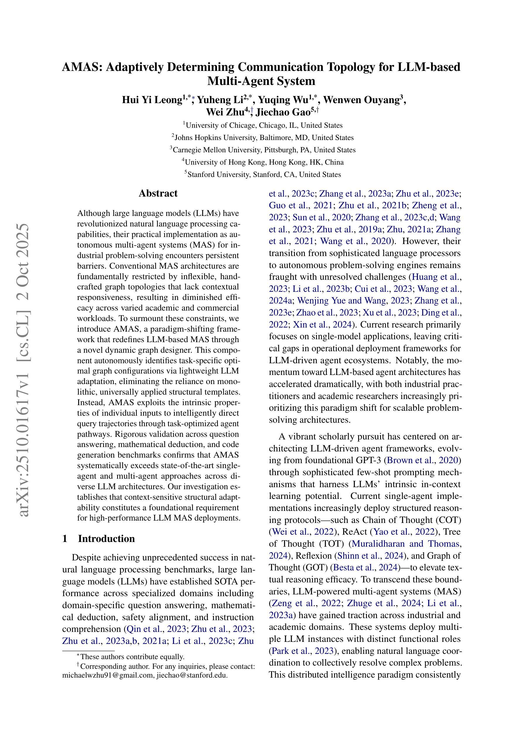 尽管大型语言模型(LLM)已经彻底改变了自然语言处理的能力,但它们在作为解决工业问题的自主多智能体系统(MAS)的实际应用中仍然面临持续存在的障碍。传统的MAS架构受到不灵活、手工制作的图形拓扑结构的根本限制,这些拓扑结构缺乏上下文响应能力,导致在多样化的学术和商业工作负载中的效率降低。为了克服这些限制,我们引入了AMAS,这是一个改变范式框架,它通过新型动态图形设计者重新定义了基于LLM的MAS。该组件通过轻量级LLM适配自主确定特定任务的优化图形配置,消除了对通用应用的单一结构模板的依赖。相反,AMAS利用单个输入的固有属性来智能地引导查询轨迹,通过任务优化的智能体路径。在问答、数学推理和代码生成基准测试上的严格验证证实,AMAS在多种LLM架构上系统地超越了最新的单智能体和多智能体方法。我们的调查表明,上下文敏感的结构适应性是高性能LLM MAS部署的基本要求。