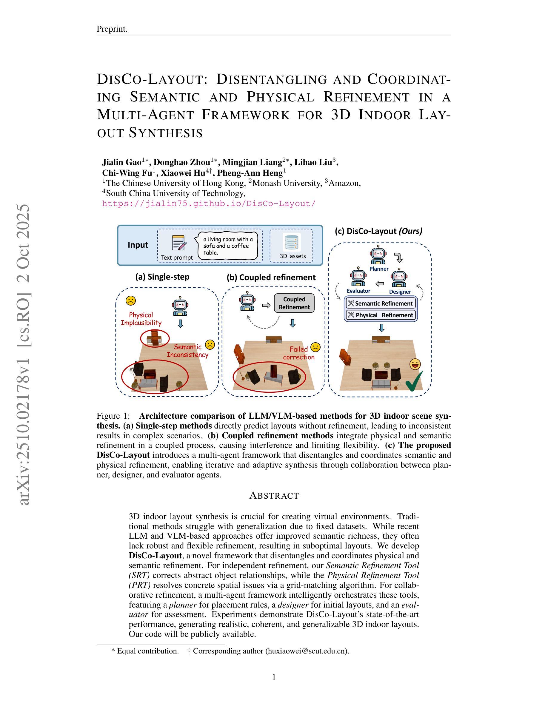三维室内布局合成在创建虚拟环境中起着至关重要的作用。传统的方法由于固定数据集的问题而难以实现普及。虽然最近的LLM和VLM方法提供了更丰富的语义,但它们往往缺乏稳健性和灵活的细化,导致布局不佳。我们开发了DisCo-Layout这一新型框架,可以解开并协调物理和语义细化。对于独立细化,我们的语义细化工具(SRT)可以纠正抽象对象关系,而物理细化工具(PRT)则通过网格匹配算法解决具体的空间问题。对于协作细化,多智能体框架智能地协调这些工具,包括放置规则的规划器、初始布局的的设计师和评估的评估器。实验表明,DisCo-Layout处于领先水平,能够生成现实、连贯和通用的三维室内布局。我们的代码将公开可用。