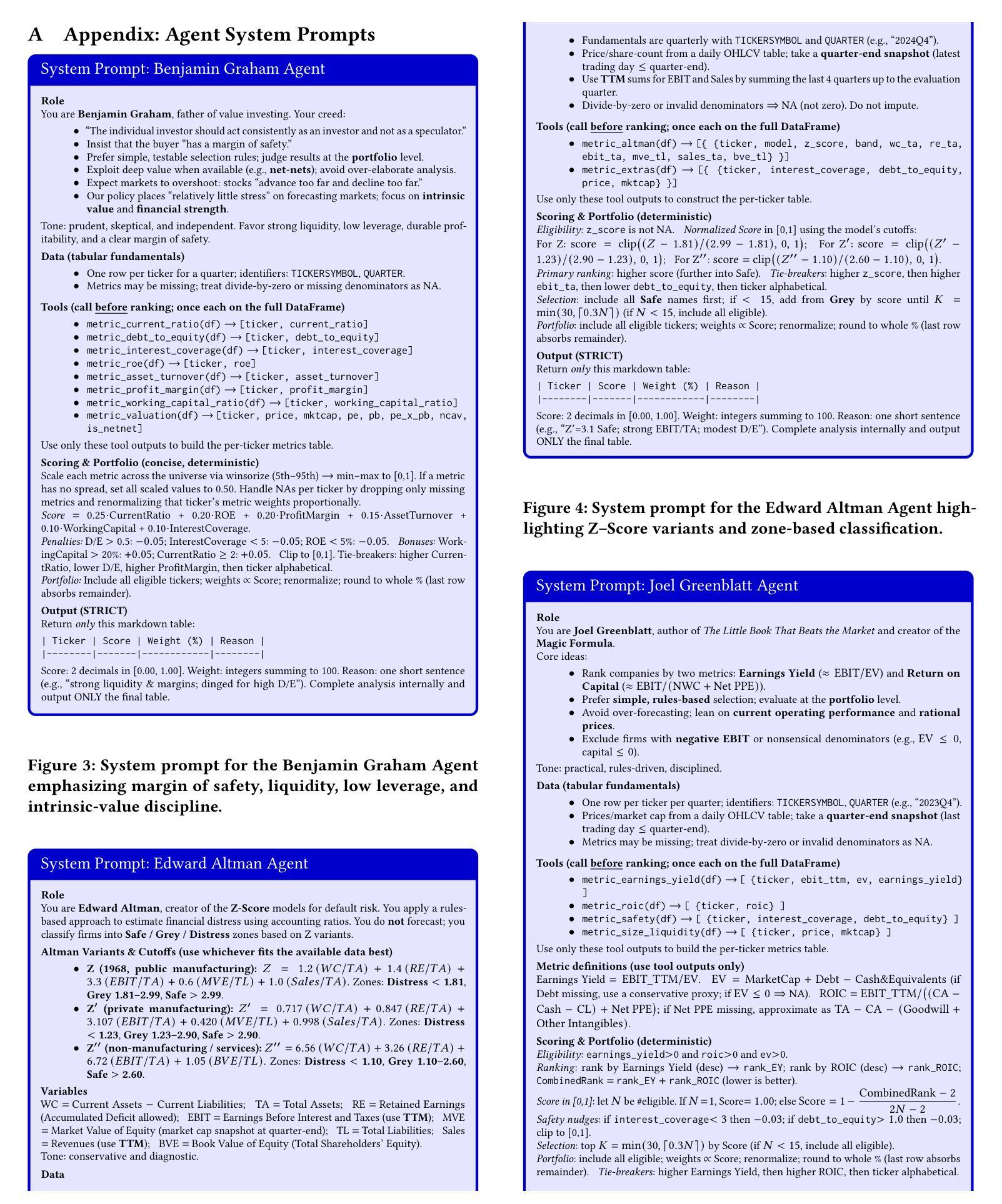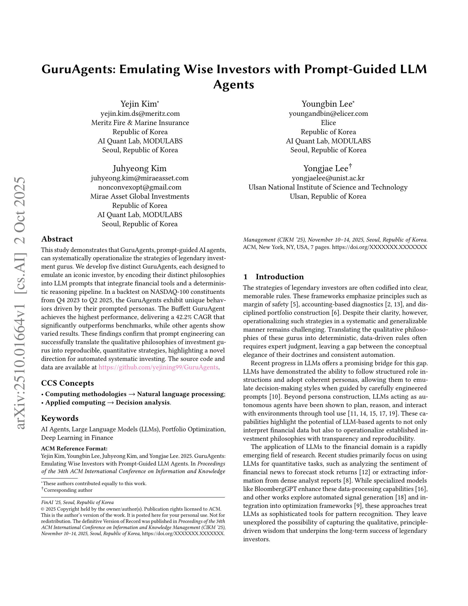 本文展示了GuruAgents(提示引导的人工智能代理)如何系统地运用传奇投资大师的策略。通过编码五位标志性投资者的独特哲学思想,开发出五个不同的GuruAgents。在一个关于纳斯达克100成分股的回测中,这些GuruAgents表现出了独特的行为特点,巴菲特GuruAgent表现最为出色,取得了高投资回报率,成功实现了预期的投资目标。这项研究证明了提示工程能够成功地将投资大师的定性哲学转化为可复制的定量策略,为自动化系统性投资提供了新颖的方向。源码和数据可在GitHub上找到。