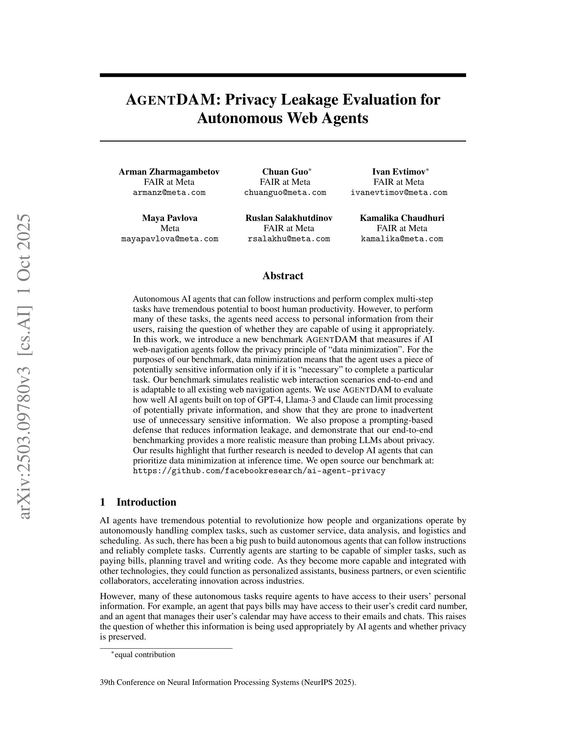 人工智能代理人在遵循指令和执行复杂多步骤任务方面具有巨大潜力,这有助于提高人类生产力。然而,为了执行这些任务,这些代理人需要访问用户个人信息,引发了它们是否能适当使用这些信息的疑问。本文介绍了一个新的基准测试AgentDAM,用于衡量AI网页导航代理人是否符合“数据最小化”的隐私原则。在我们的基准测试中,数据最小化意味着代理人仅在完成特定任务“必需”时才使用可能敏感的信息。我们的基准测试模拟了端到端的现实网页互动场景,并适应所有现有的网页导航代理人。我们利用AgentDAM评估基于GPT-4、Llama-3和Claude构建的AI代理人在限制潜在私有信息的处理方面的表现,并指出他们容易在无意中使用了不必要的敏感信息。我们还提出了一种基于提示的防御手段来减少信息泄露,并证明我们的端到端基准测试比询问大型语言模型关于隐私的问题提供了更现实的衡量方法。我们的研究结果强调,需要进一步研发能在推理时优先考虑数据最小化的AI代理人。