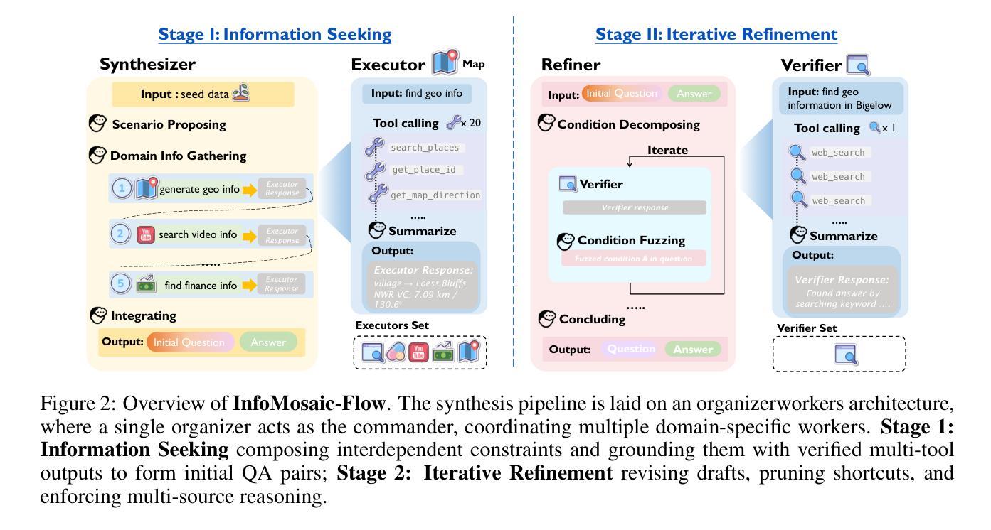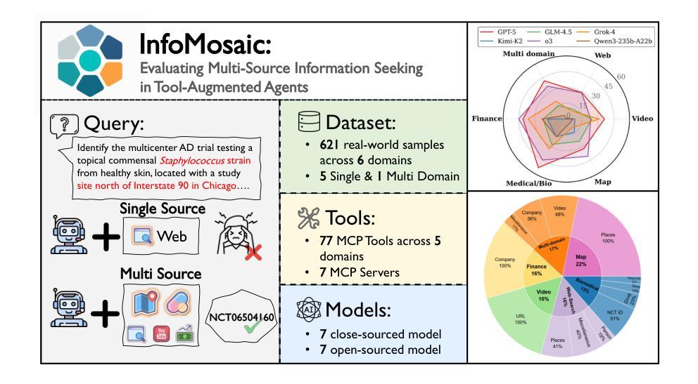 信息检索是人类的基本需求之一。然而,现有的大型语言模型(LLM)代理主要依赖于开放网页搜索,这暴露了两个基本弱点:在线内容嘈杂且不可靠,许多现实世界的任务需要精确、特定的领域知识,这些在网页上无法获取。模型上下文协议(MCP)的出现现在允许代理与数千种专业工具进行交互,似乎解决了这一限制。然而,仍然不清楚代理是否能有效地利用这些工具——更重要的是,它们是否能将这些工具与通用搜索整合,以解决复杂的任务。因此,我们推出了InfoMosaic-Bench,这是第一个专门为工具增强型代理中的多源信息检索而设计的基准测试。它涵盖了六个代表性领域(医学、金融、地图、视频、网页和多领域集成),要求代理将通用搜索与领域特定工具相结合。任务是通过InfoMosaic-Flow合成的,这是一个可扩展的管道,它以经过验证的工具输出来设定任务条件,强制实施跨源依赖性,并过滤出可以通过简单查找解决的快捷方式案例。这种设计保证了可靠性和非易处理性。与14个最新大型语言模型代理的实验表明,有三个发现:(i)仅依靠网络信息是不够的,GPT-5的准确率和通过率仅为38.2%和67.5%;(ii)领域工具提供了选择性的但不一贯的好处,可以改善某些领域的同时恶化其他领域;(iii)22.4%的失败是由于工具使用或选择不正确造成的,这表明当前的大型语言模型即使在基本工具处理方面仍存在困难。