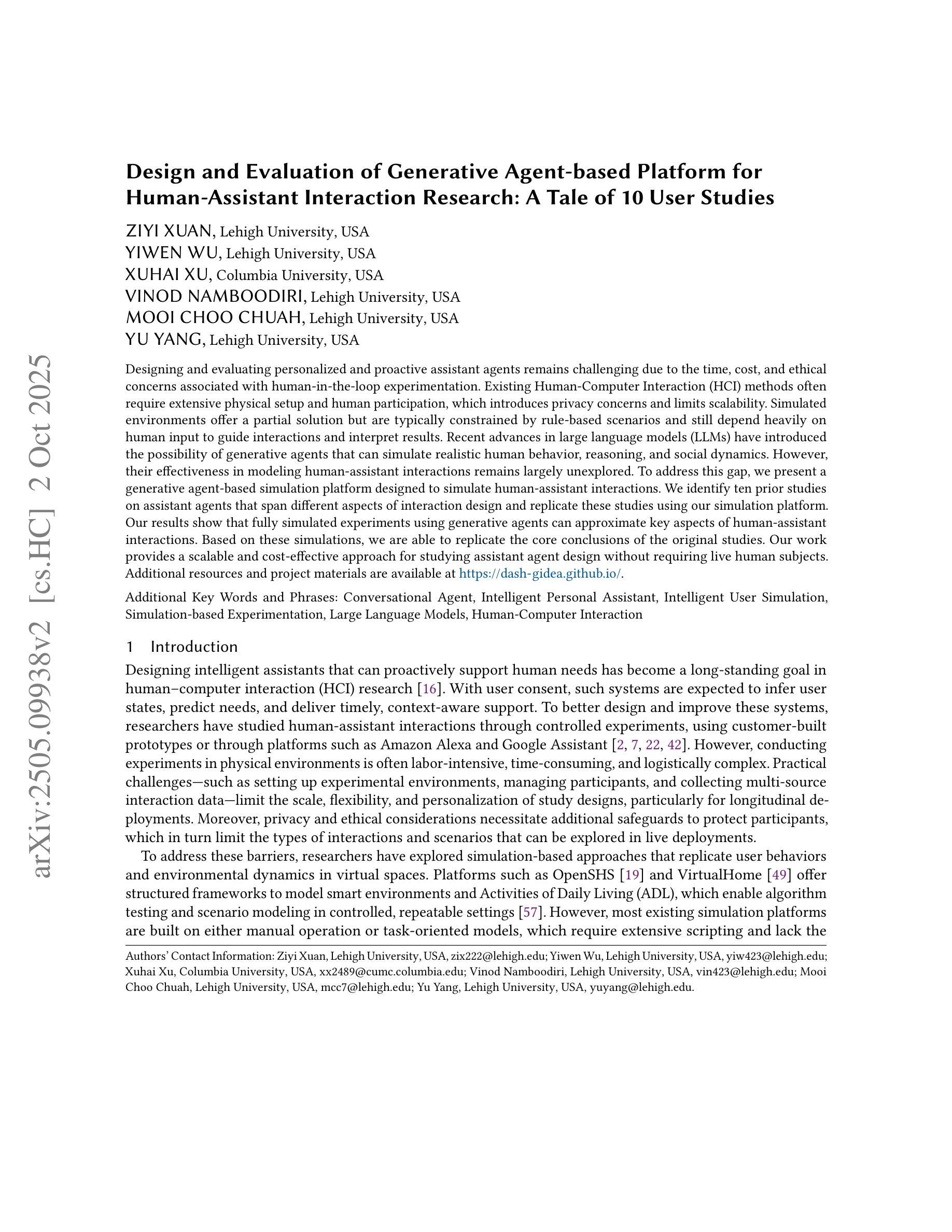 Design and Evaluation of Generative Agent-based Platform for Human-Assistant Interaction Research: A Tale of 10 User Studies