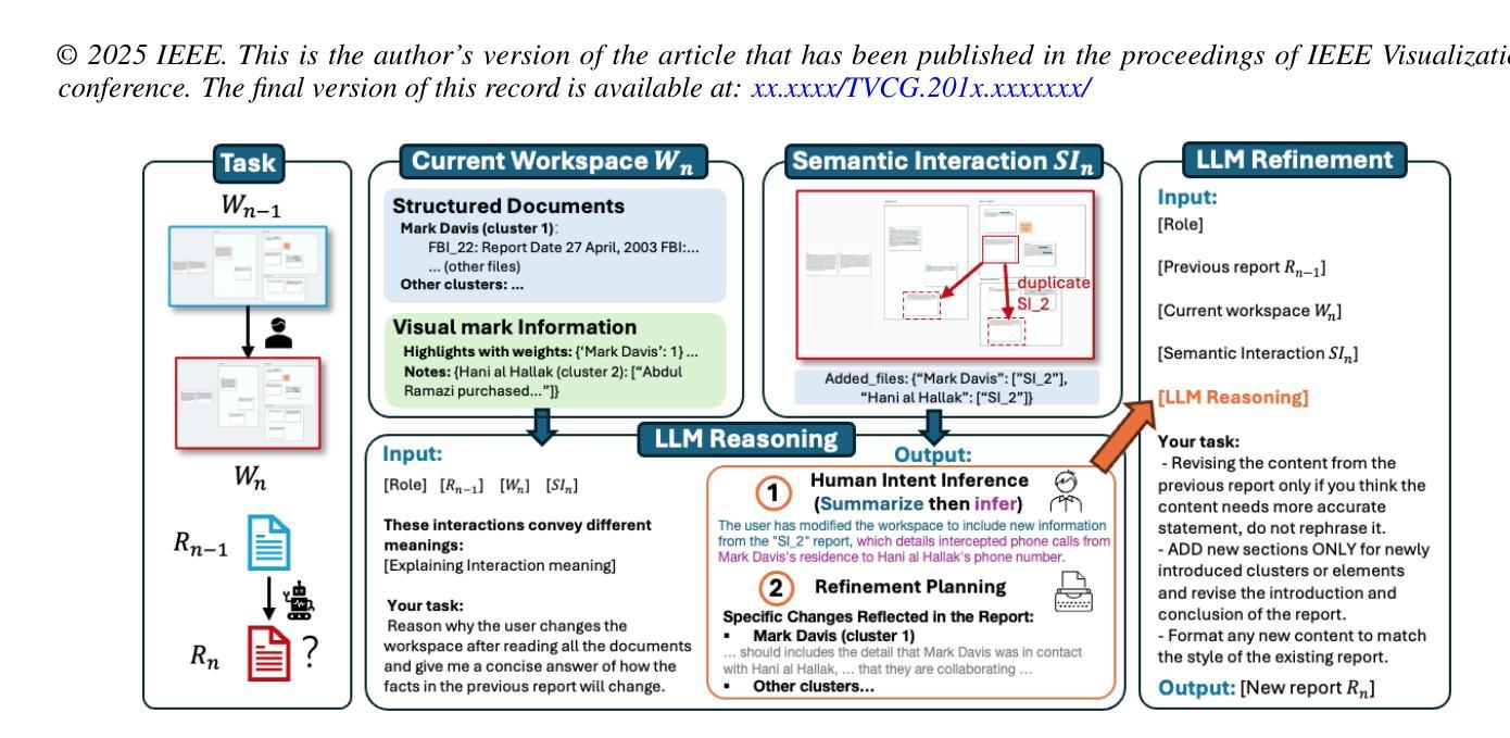 感知报告写作往往需要多次迭代和细化过程。虽然大型语言模型(LLM)在基于人类视觉工作空间表示生成初步报告方面显示出潜力,但它们难以在细化过程中精确地融入连续的语义交互。我们引入了VIS-ReAct框架,该框架能够推理视觉工作空间中新增的语义交互,以引导LLM进行报告细化。VIS-ReAct是一个两agent框架:主要LLM分析agent解释新的语义交互来推断用户意图并生成细化计划,然后是相应的LLM细化agent更新报告。通过案例研究,VIS-ReAct在目标细化、语义保真和透明推理方面优于基准和VIS-ReAct(无LLM分析)。结果表明,VIS-ReAct更好地处理了各种交互类型和粒度,同时提高了人-LLM合作的透明度。