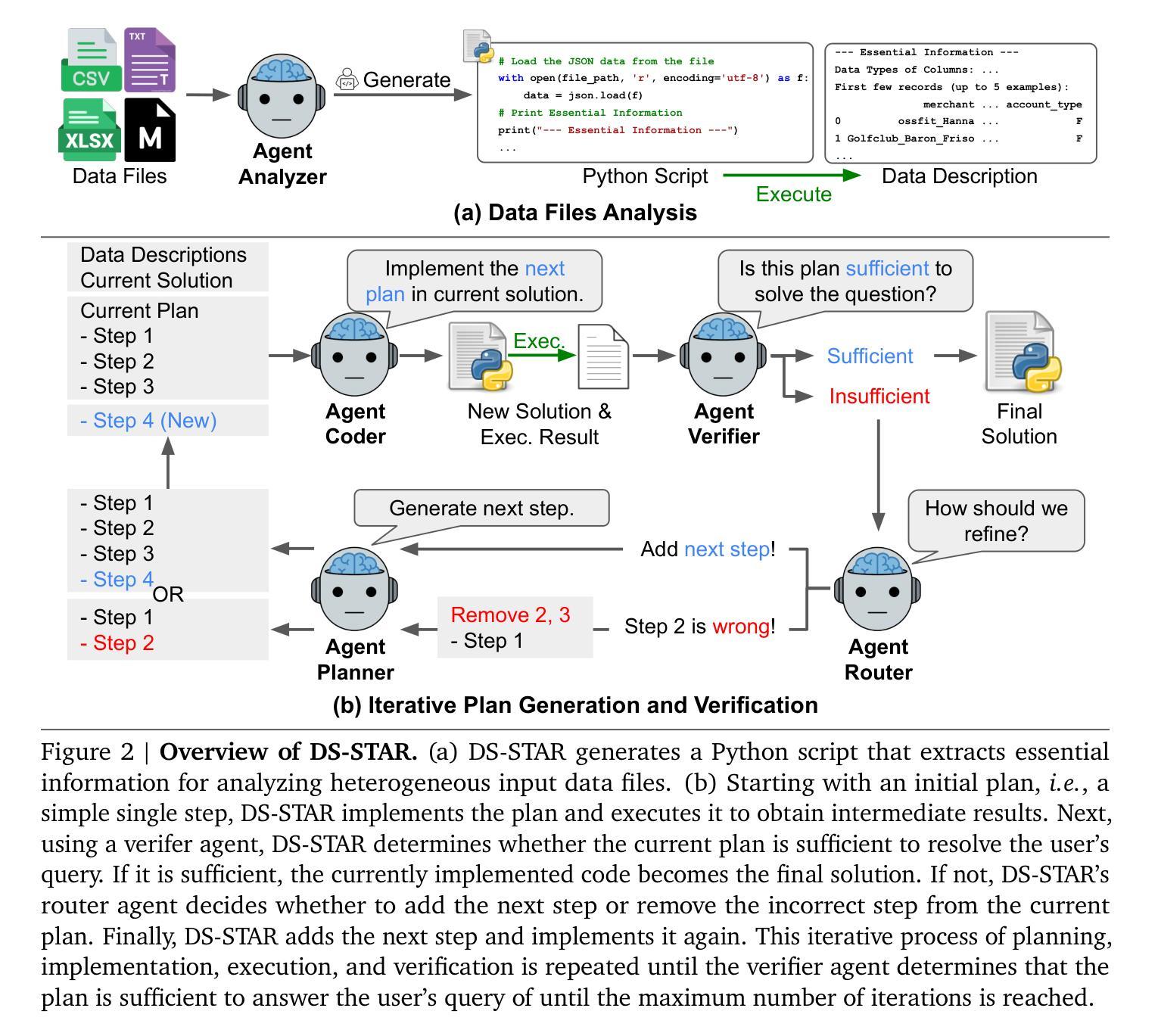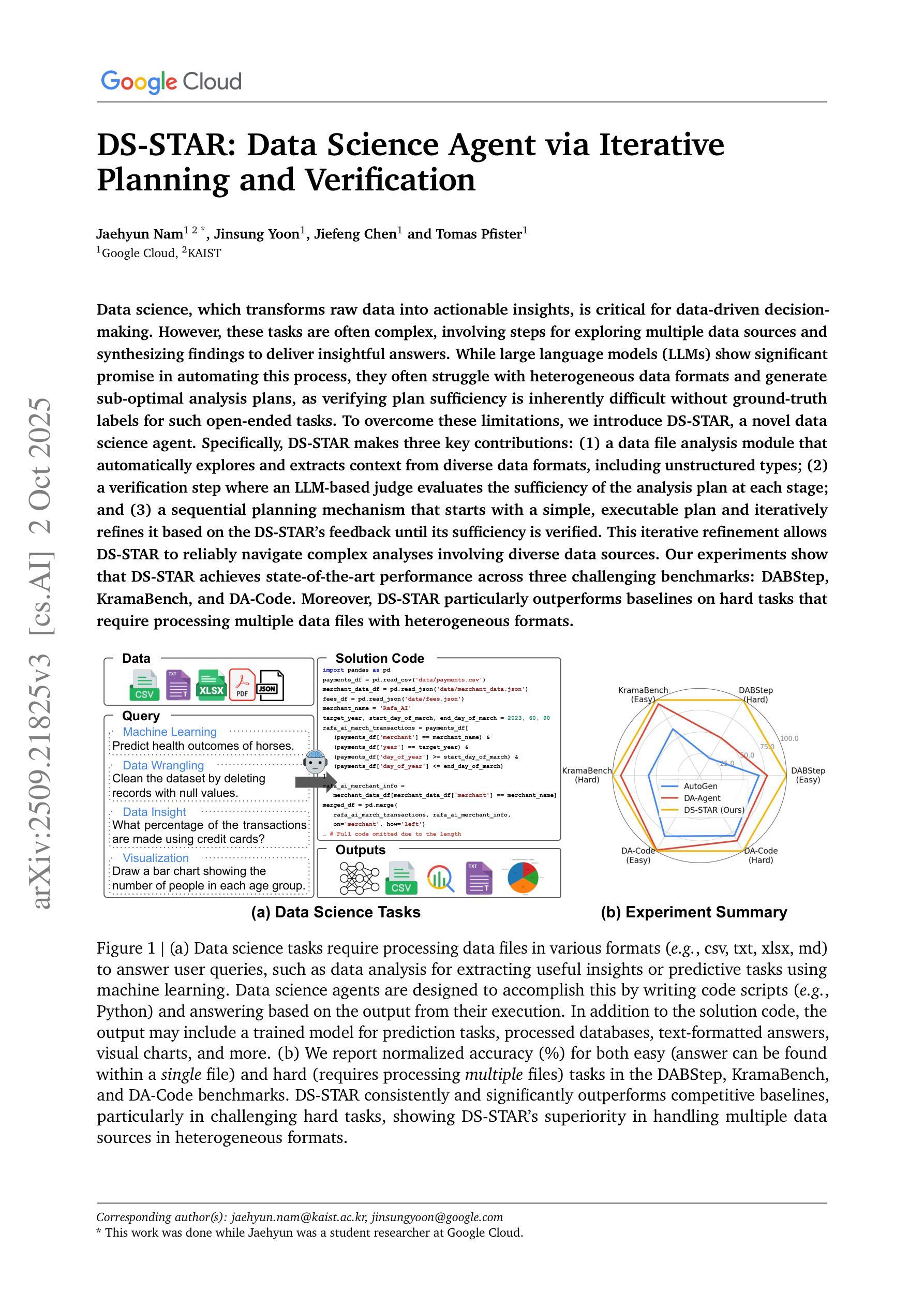 数据科学能够将原始数据转化为可操作的见解,对于数据驱动决策至关重要。然而,这一过程复杂,涉及探索多个数据源和合成发现以提供深刻答案的步骤。尽管大型语言模型(LLMs)在自动化此过程中显示出巨大潜力,但它们常常处理具有不同格式的数据时遇到困难,并产生次优的分析计划,因为验证计划的充分性对于此类开放任务而言,没有真实标签,本质上很难进行。为了克服这些限制,我们引入了DS-STAR这一新型数据科学代理。DS-STAR有三个主要贡献:一是数据文件分析模块,可自动探索和提取来自各种数据格式(包括非结构化类型)的上下文;二是验证步骤,采用LLM作为法官评估分析计划的充分性;三是顺序规划机制,从简单可执行的计划开始,根据DS-STAR的反馈逐步对其进行改进,直至验证其充分性。这种迭代优化使DS-STAR能够可靠地处理涉及多种数据源的复杂分析。实验表明,DS-STAR在DABStep、KramaBench和DA-Code三个具有挑战性的基准测试中取得了最新技术水平的性能表现。特别是在处理具有不同格式的多数据文件等困难任务时,DS-STAR表现尤为出色。