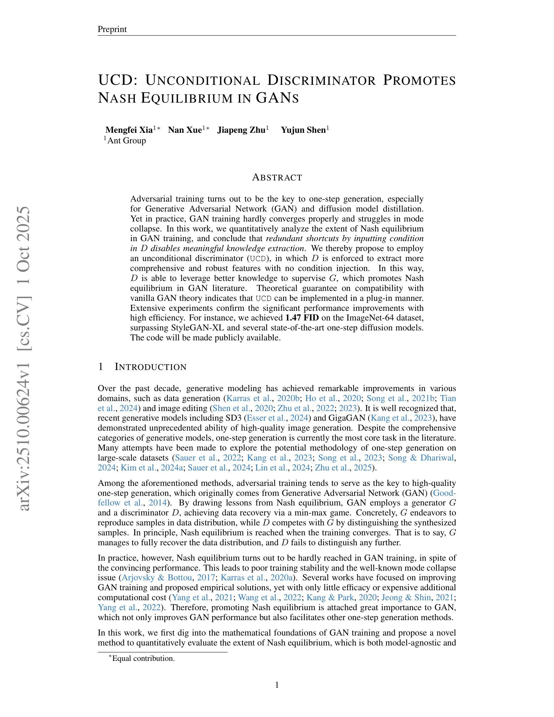 对抗性训练被证明是一步生成的关键,特别是在生成对抗网络(GAN)和扩散模型蒸馏中。然而在实践中,GAN训练很难正确收敛,并且在模式崩溃中挣扎。在这项工作中,我们定量分析了GAN训练中纳什均衡的程度,并得出结论:在D中输入条件的冗余捷径阻碍了有意义的知识提取。因此,我们提出采用无条件鉴别器(UCD),其中D被强制提取更综合和更稳健的特征,没有条件注入。通过这种方式,D能够利用更好的知识来监督G,这促进了GAN文献中的纳什均衡。与常规GAN理论兼容的理论保证表明UCD可以以插件方式实现。大量实验证实了显著的性能改进和高效率。例如,我们在ImageNet-64数据集上取得了1.47 FID的成绩,超过了StyleGAN-XL和几种先进的一步扩散模型。代码将公开可用。