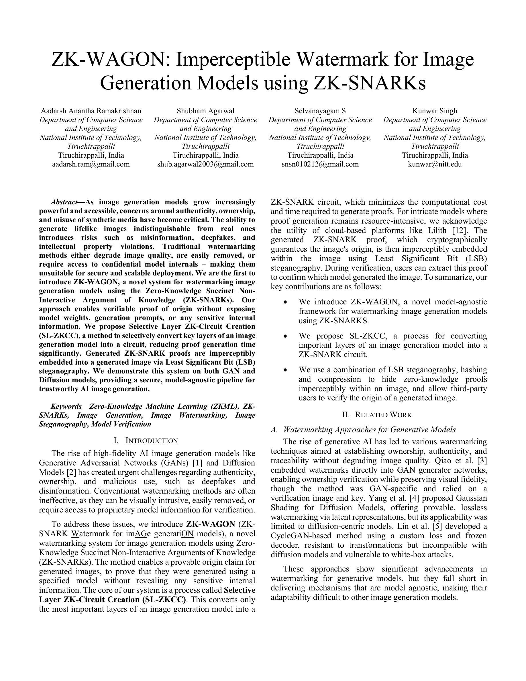 随着图像生成模型的强大和普及,关于合成媒体的真实性和所有权问题变得愈发重要。生成逼真图像的能力可能导致误传信息、深度伪造和侵犯知识产权等风险。传统的水印方法要么会降低图像质量,要么容易被移除,或者需要访问模型的内部机密信息,因此不适合进行安全且可扩展的部署。本文首次引入ZK-WAGON系统,采用零知识简洁非交互式论证知识(ZK-SNARKs)为图像生成模型添加水印。此方法可以在不暴露模型权重、生成提示或任何敏感内部信息的情况下验证图像来源。本文提出选择性层ZK电路创建(SL-ZKCC)方法,将图像生成模型的关键层选择性转换为电路,大幅减少证明生成时间。通过最低有效位(LSB)隐写术将生成的ZK-SNARK证明嵌入生成的图像中。该系统在GAN和扩散模型上均得到验证,为可信AI图像生成提供了一个安全、模型无关的解决方案。