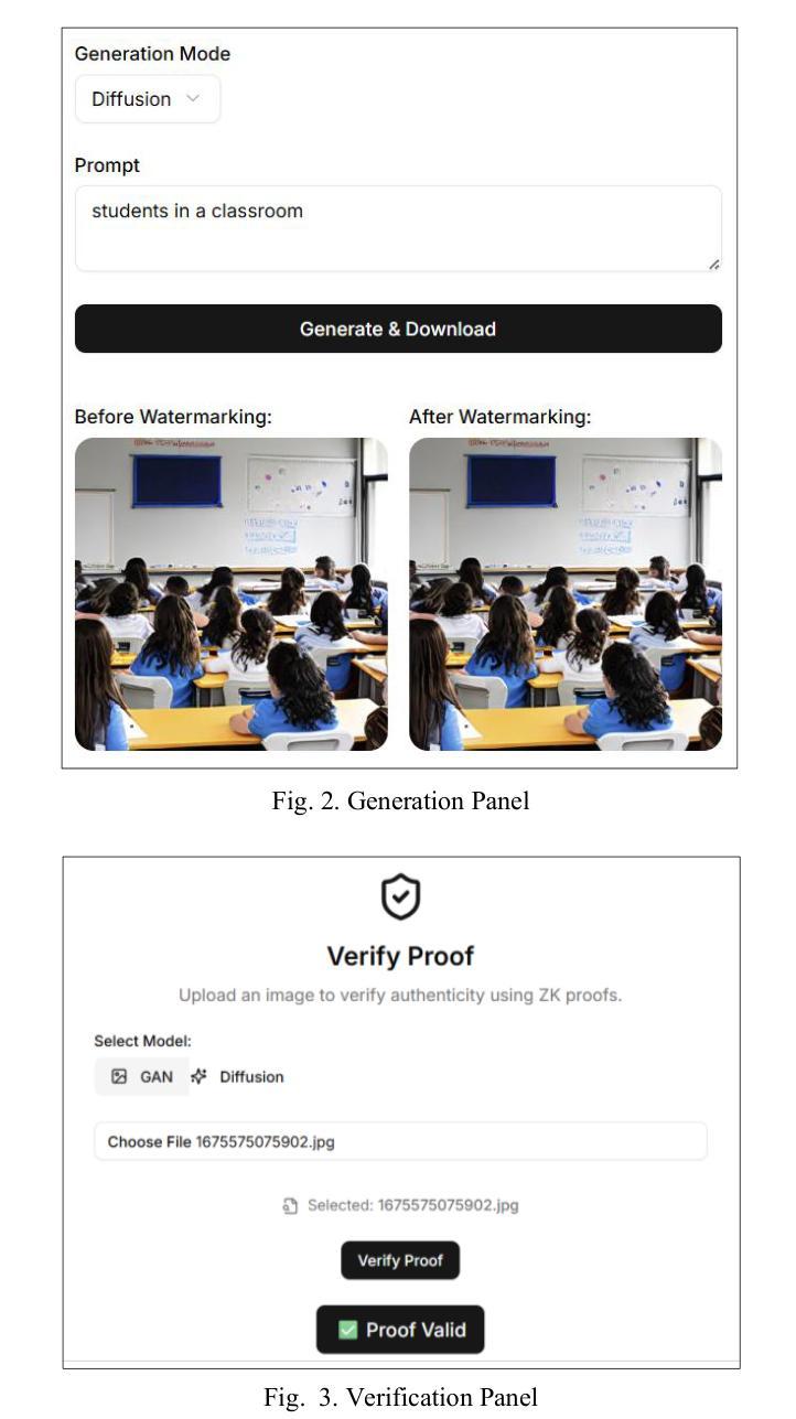 随着图像生成模型的强大性和可访问性不断增长,关于合成媒体的真实性、所有权和误用的担忧变得至关重要。能够生成与现实无法区分的逼真图像,带来了诸如虚假信息、深度伪造和知识产权侵犯等风险。传统的水印方法要么会降低图像质量,要么容易被移除,或者需要访问保密模型内部,这使得它们不适合进行安全和可扩展的部署。我们首次引入了ZK-WAGON系统,这是一种使用零知识简洁非交互式论证知识(ZK-SNARKs)为图像生成模型加水印的新方法。我们的方法能够在不暴露模型权重、生成提示或任何敏感内部信息的情况下,验证图像来源。我们提出了选择性层ZK电路创建(SL-ZKCC)方法,该方法能够有选择地将图像生成模型的关键层转换为电路,从而显著减少证明生成时间。生成的ZK-SNARK证明通过最低有效位(LSB)隐写术不可察觉地嵌入到生成的图像中。我们在生成对抗网络(GAN)和扩散模型上都展示了这一系统,为可信的AI图像生成提供了一个安全、模型无关的流程。