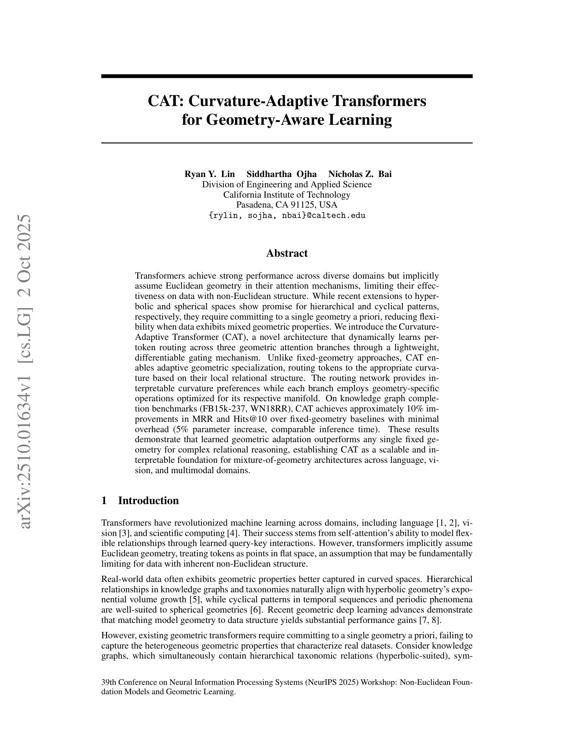 Transformer在不同领域表现优异,但其在注意力机制中隐含了欧几里得几何的假设,这对于具有非欧几里得结构的数据存在局限性。虽然最近对双曲空间和球面空间的扩展对层次模式和循环模式显示出希望,但它们需要预先确定单一几何形状,当数据呈现混合几何属性时,灵活性降低。本文介绍了曲率自适应Transformer(CAT),这是一种新型架构,它通过轻量级、可微分的门控机制,动态地学习每个符号在三种几何注意力分支之间的路由。与固定几何方法不同,CAT能够实现自适应的几何专业化,根据符号的局部关系结构将其路由到适当的曲率。路由网络提供可解释的曲率偏好,同时每个分支为其特定的流形使用优化的几何特定操作。在知识图谱完成基准测试(FB15k-237、WN18RR)中,与固定几何基准测试相比,CAT在MRR和Hits@10上实现了约10%的改进,并且具有极小的额外负担(参数增加5%,推理时间相当)。这些结果表明,对于复杂关系推理而言,学习到的几何适应性优于任何单一的固定几何。因此CAT成为语言、视觉和多模态领域混合几何架构的可扩展和可解释性基础。